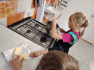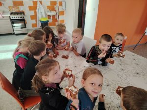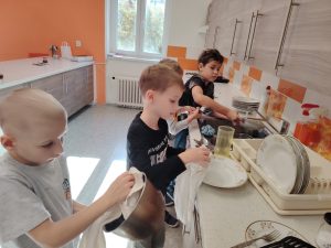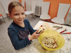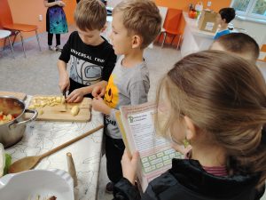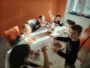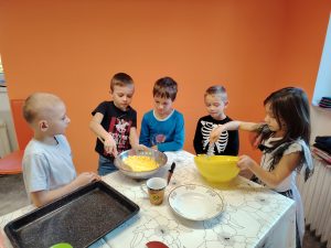 Loni jsme si vyrobili plastelínu a letos jsme se pustili do vaření. Připravili jsme si krvavou bramboračku s houbami a strašidelnou kakaovou buchtu s čokoládovými pavoučky. Protože nám ještě zbyly nějaké ingredience, tak jsme si ukuchtili ještě bramboráčky a celerové hranolky. Vaření nás moc bavilo a provoněli jsme celou školu 😊, takže se do kuchyňky chodili dívat velcí spolužáci, kteří byli namaskovaní opravdu děsivě. Chtěli jsme se podělit, ale bohužel už jsme všechno snědli, tak snad to vyjde příští rok 😊.