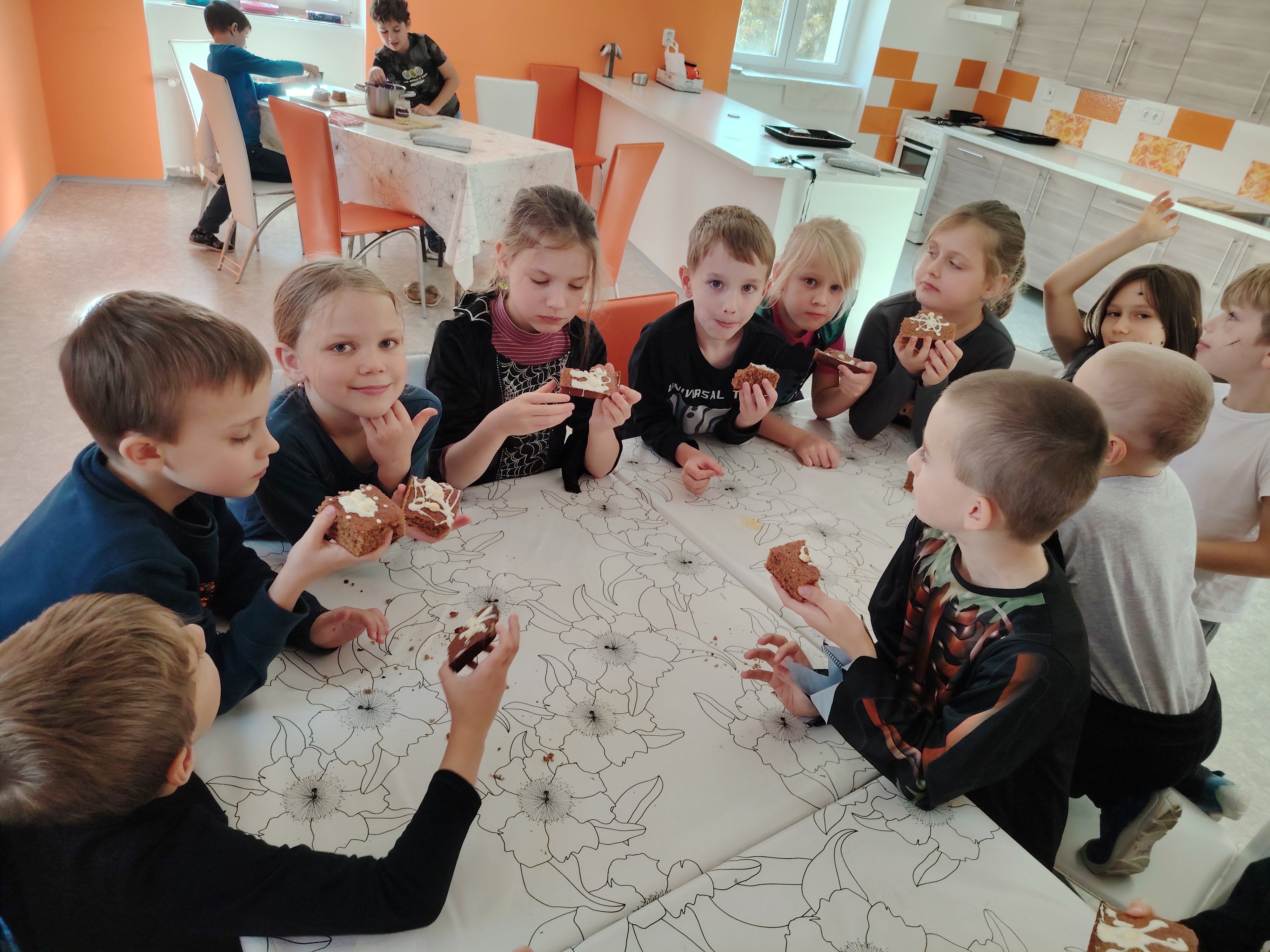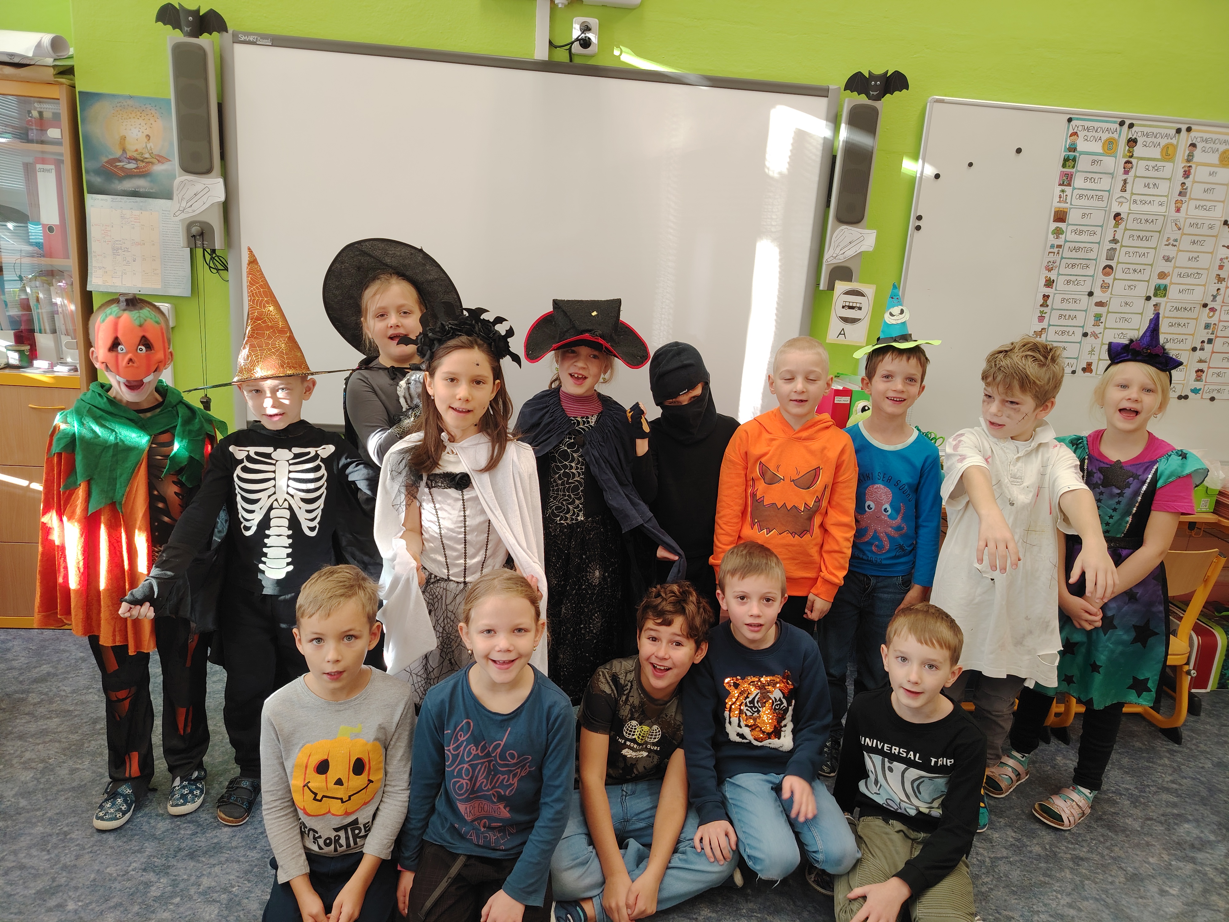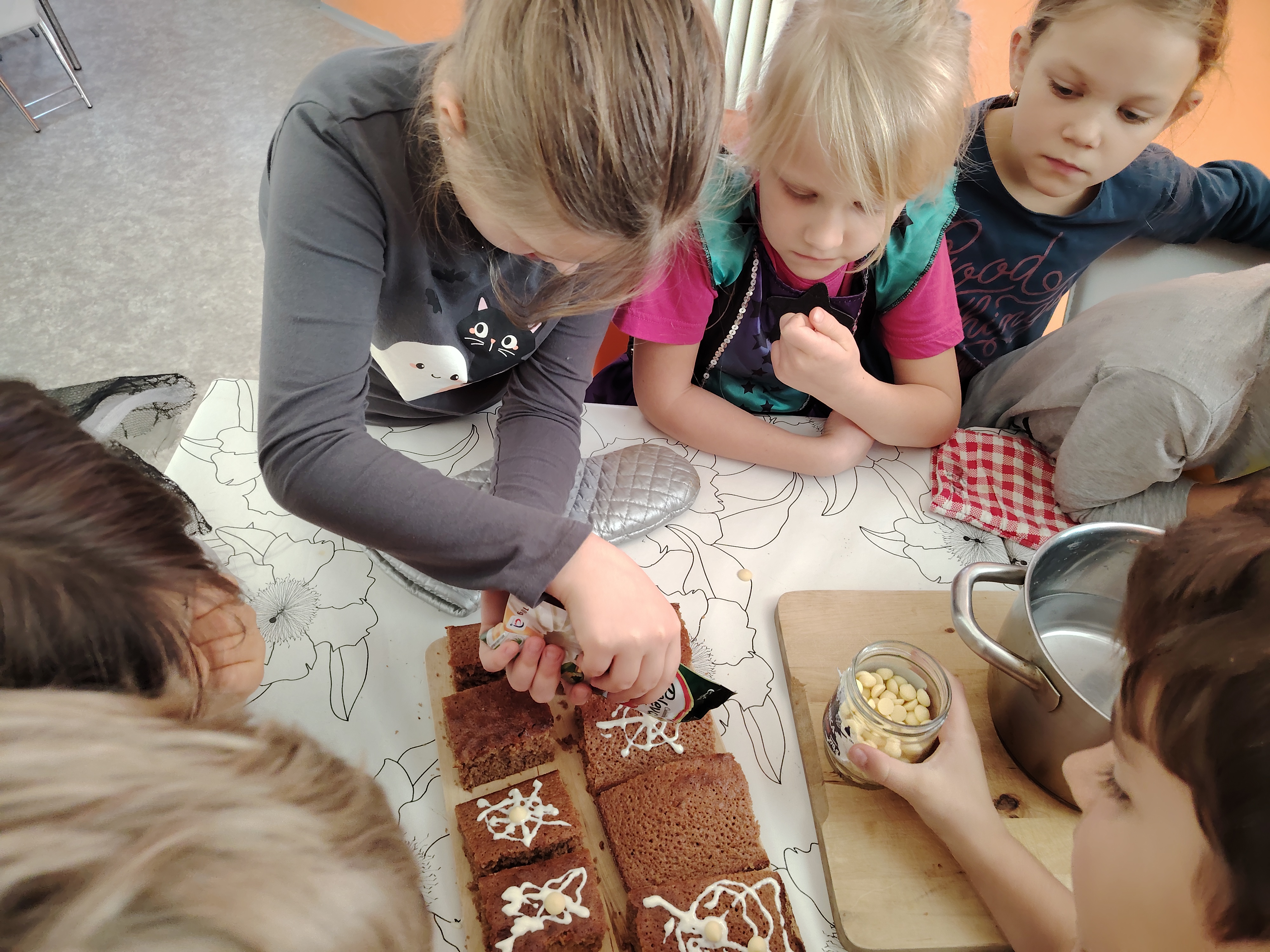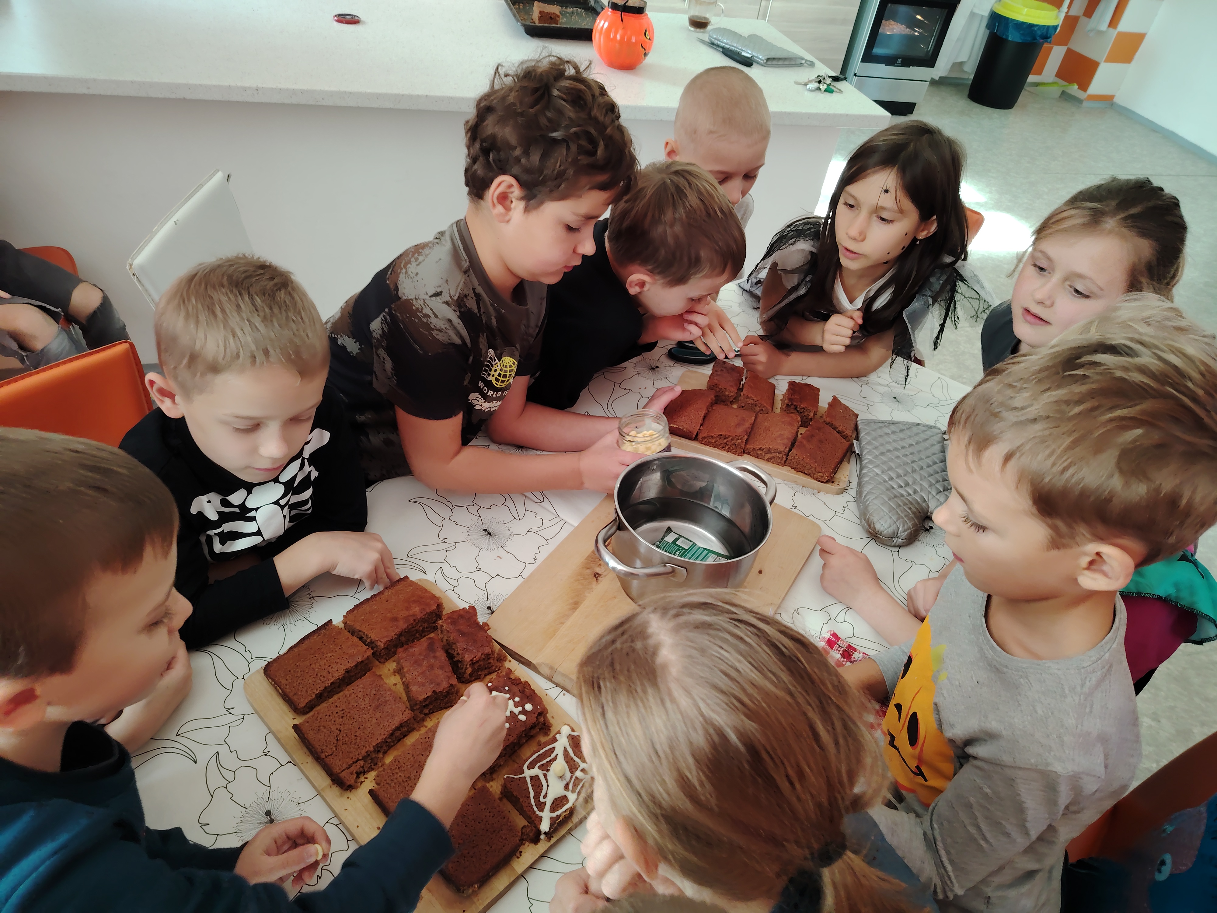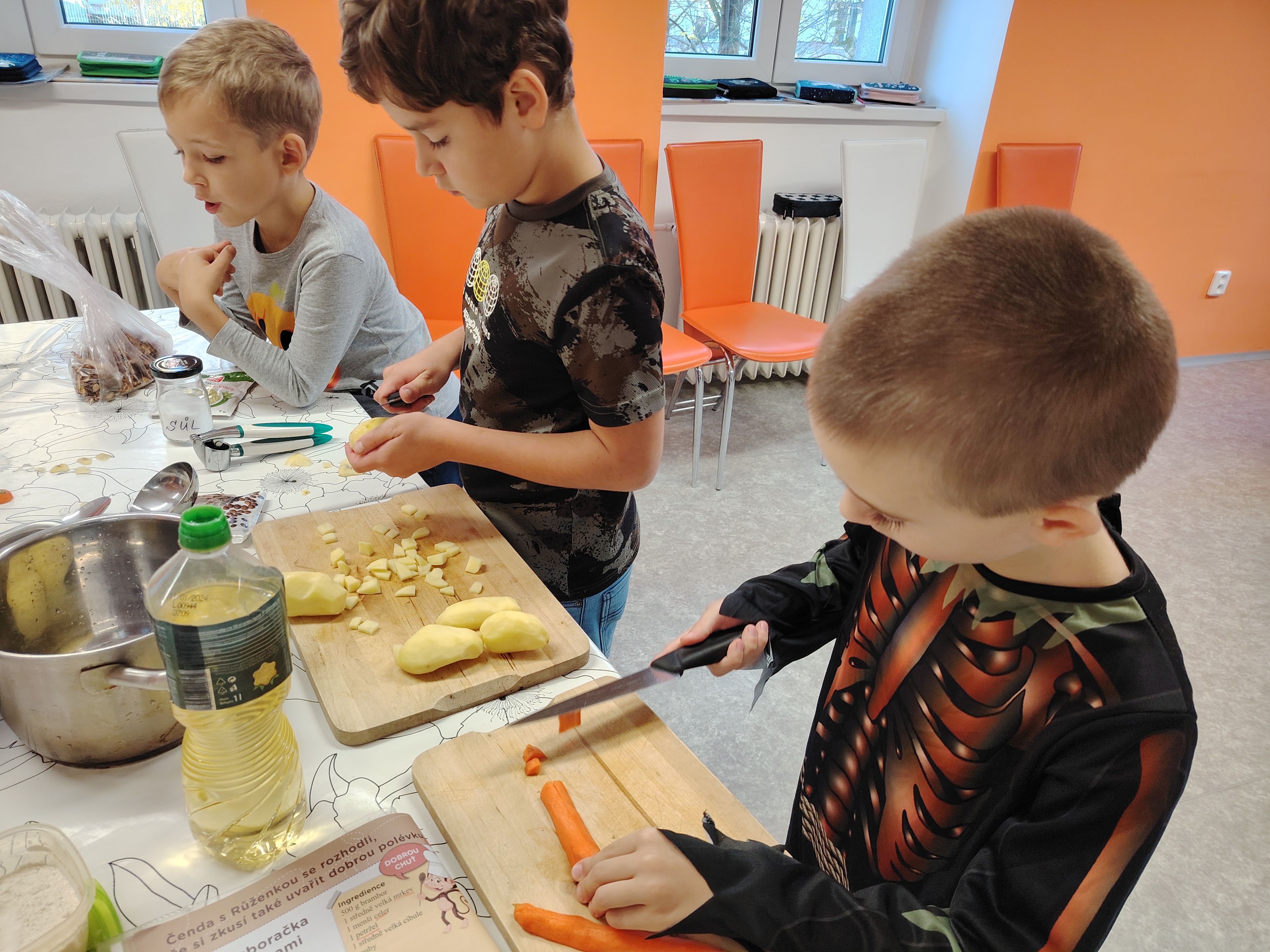 Loni jsme si vyrobili plastelínu a letos jsme se pustili do vaření. Připravili jsme si krvavou bramboračku s houbami a strašidelnou kakaovou buchtu s čokoládovými pavoučky. Protože nám ještě zbyly nějaké ingredience, tak jsme si ukuchtili ještě bramboráčky a celerové hranolky. Vaření nás moc bavilo a provoněli jsme celou školu 😊, takže se do kuchyňky chodili dívat velcí spolužáci, kteří byli namaskovaní opravdu děsivě. Chtěli jsme se podělit, ale bohužel už jsme všechno snědli, tak snad to vyjde příští rok 😊.