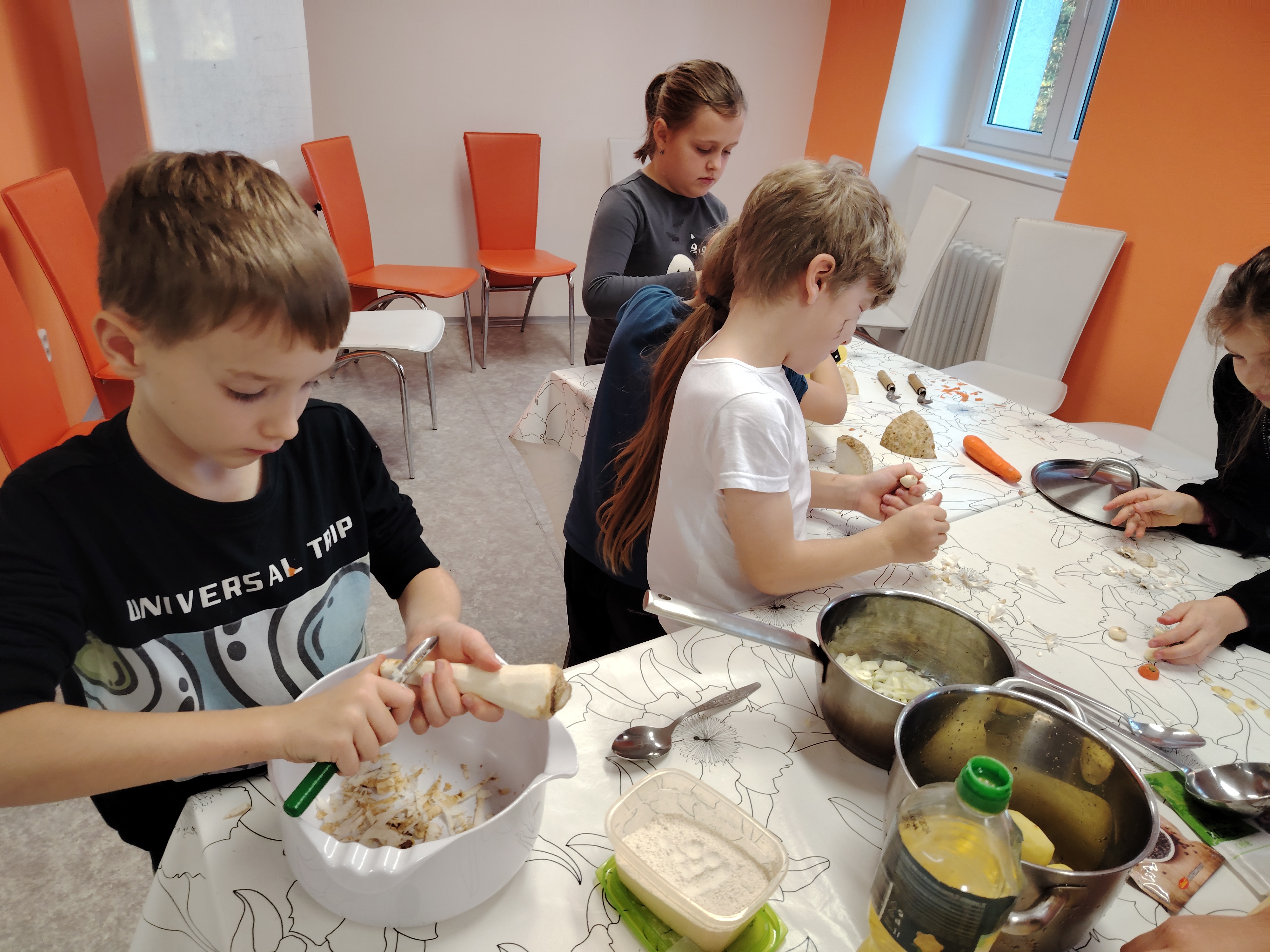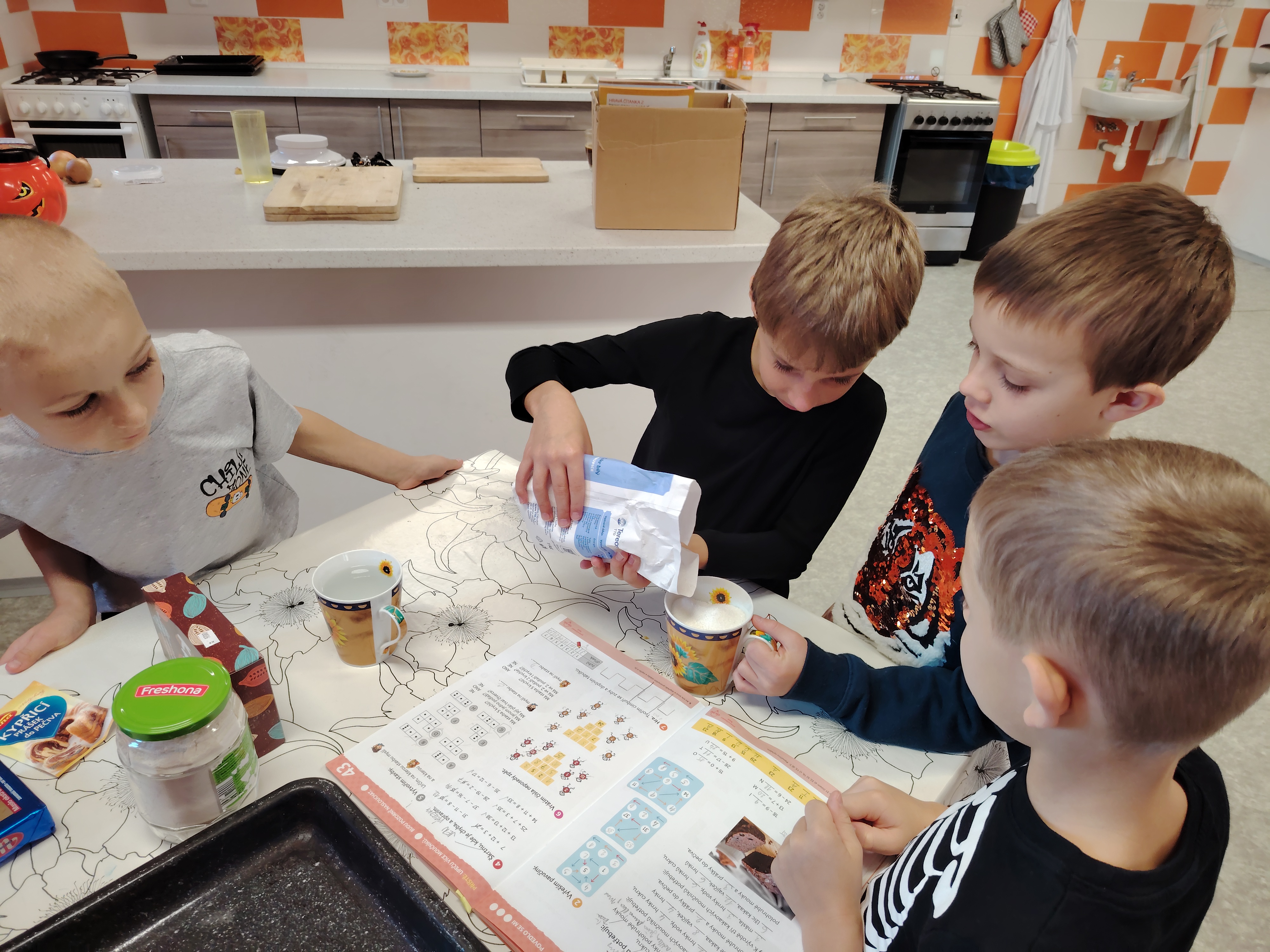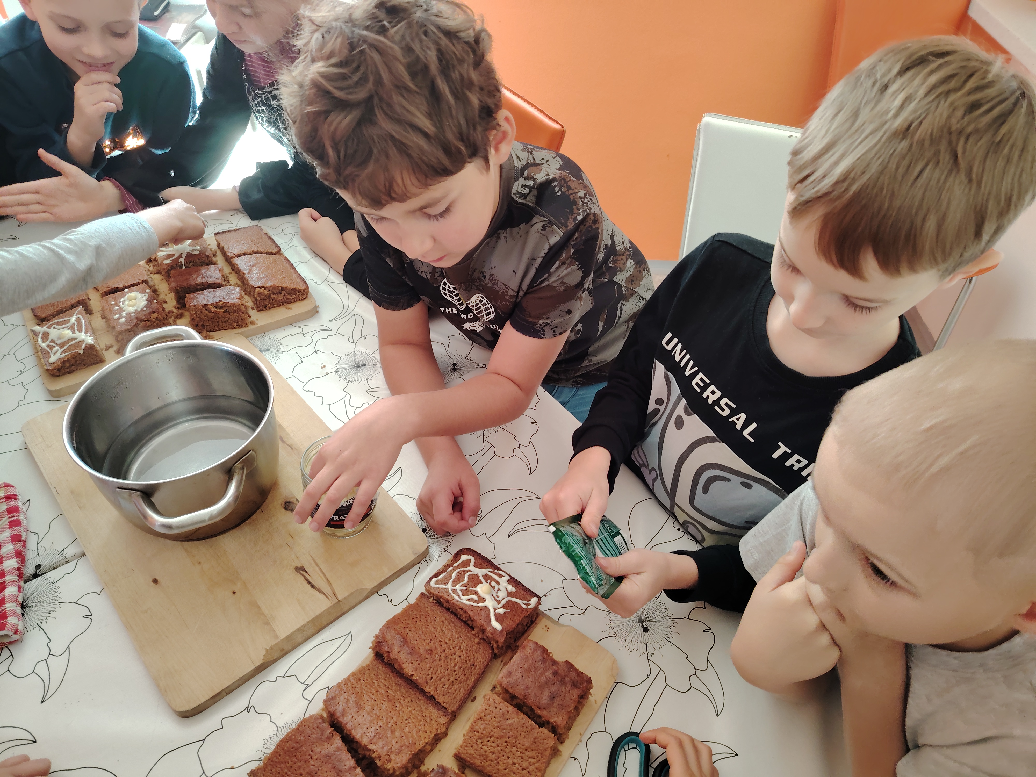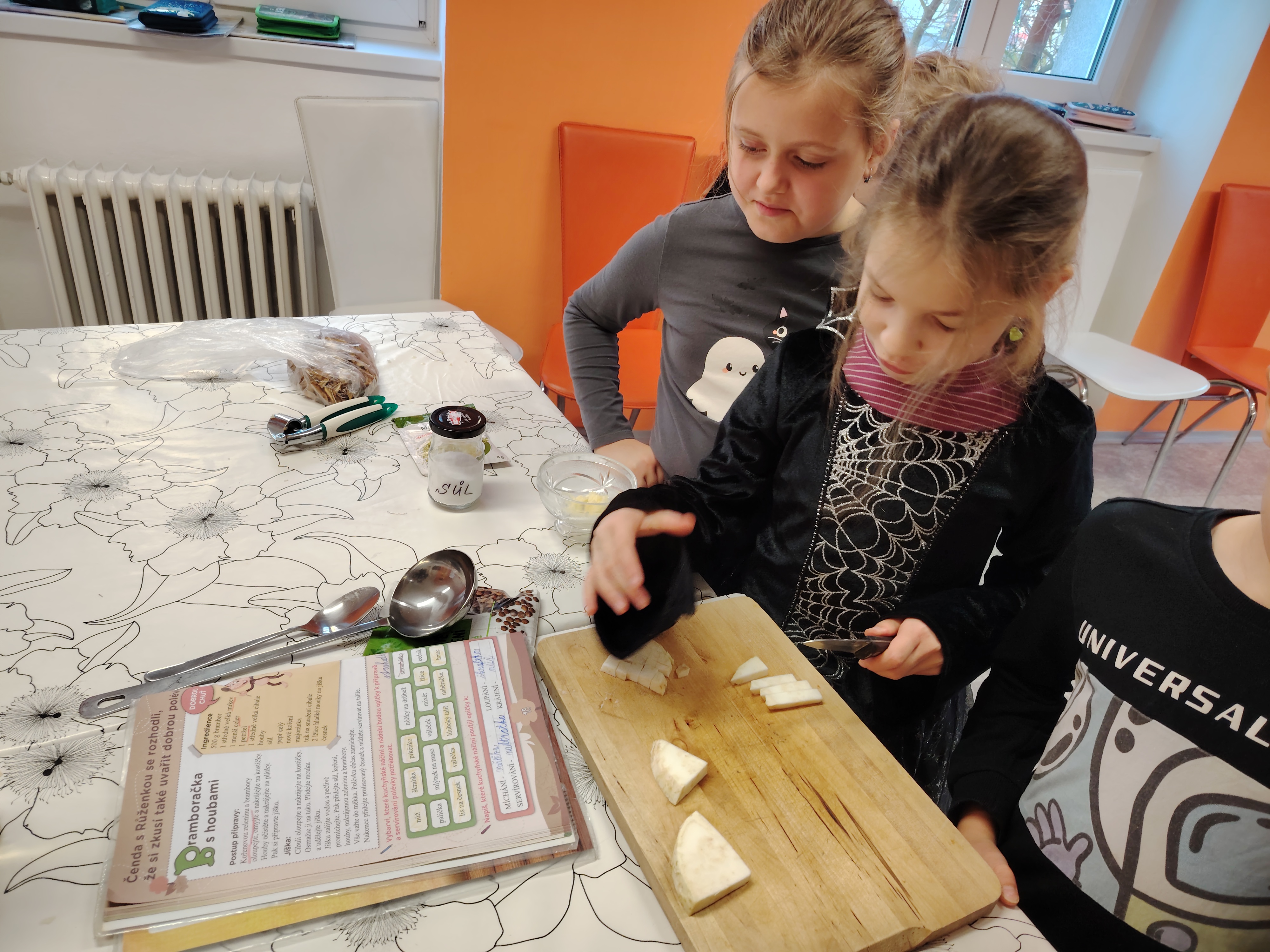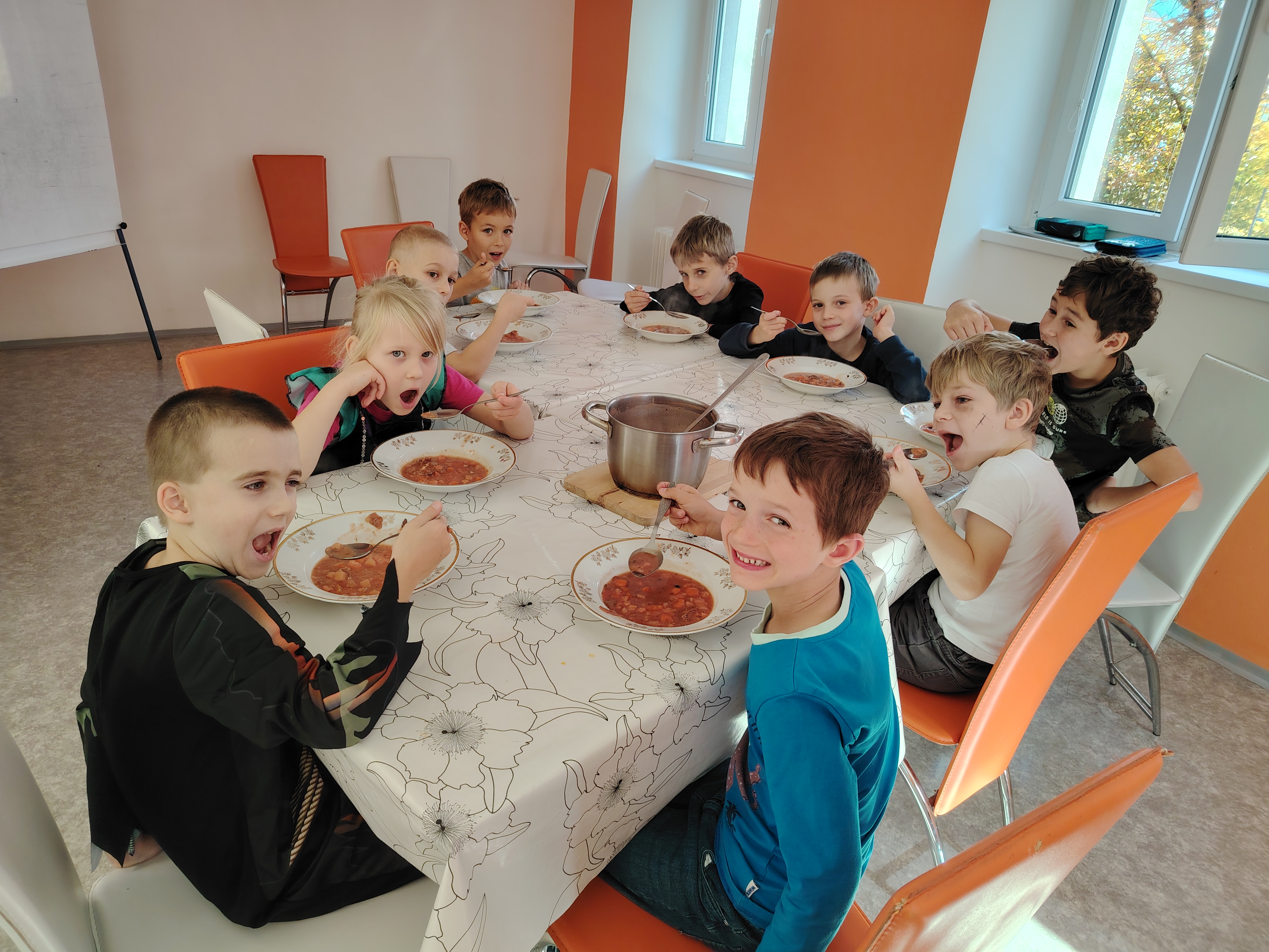 Loni jsme si vyrobili plastelínu a letos jsme se pustili do vaření. Připravili jsme si krvavou bramboračku s houbami a strašidelnou kakaovou buchtu s čokoládovými pavoučky. Protože nám ještě zbyly nějaké ingredience, tak jsme si ukuchtili ještě bramboráčky a celerové hranolky. Vaření nás moc bavilo a provoněli jsme celou školu 😊, takže se do kuchyňky chodili dívat velcí spolužáci, kteří byli namaskovaní opravdu děsivě. Chtěli jsme se podělit, ale bohužel už jsme všechno snědli, tak snad to vyjde příští rok 😊.