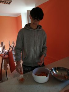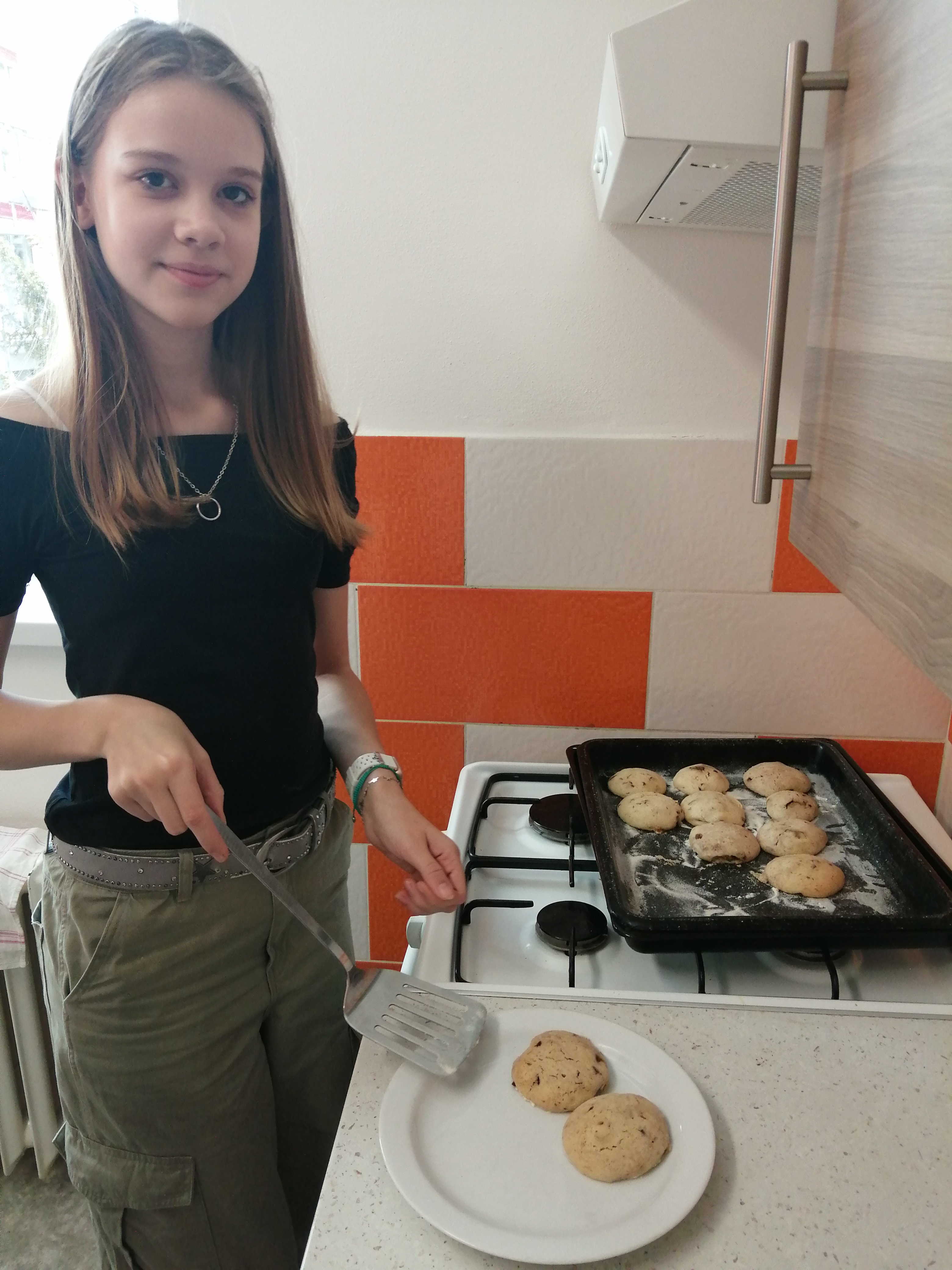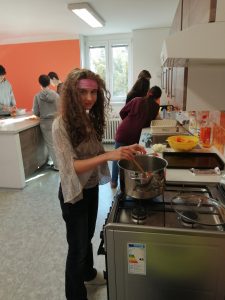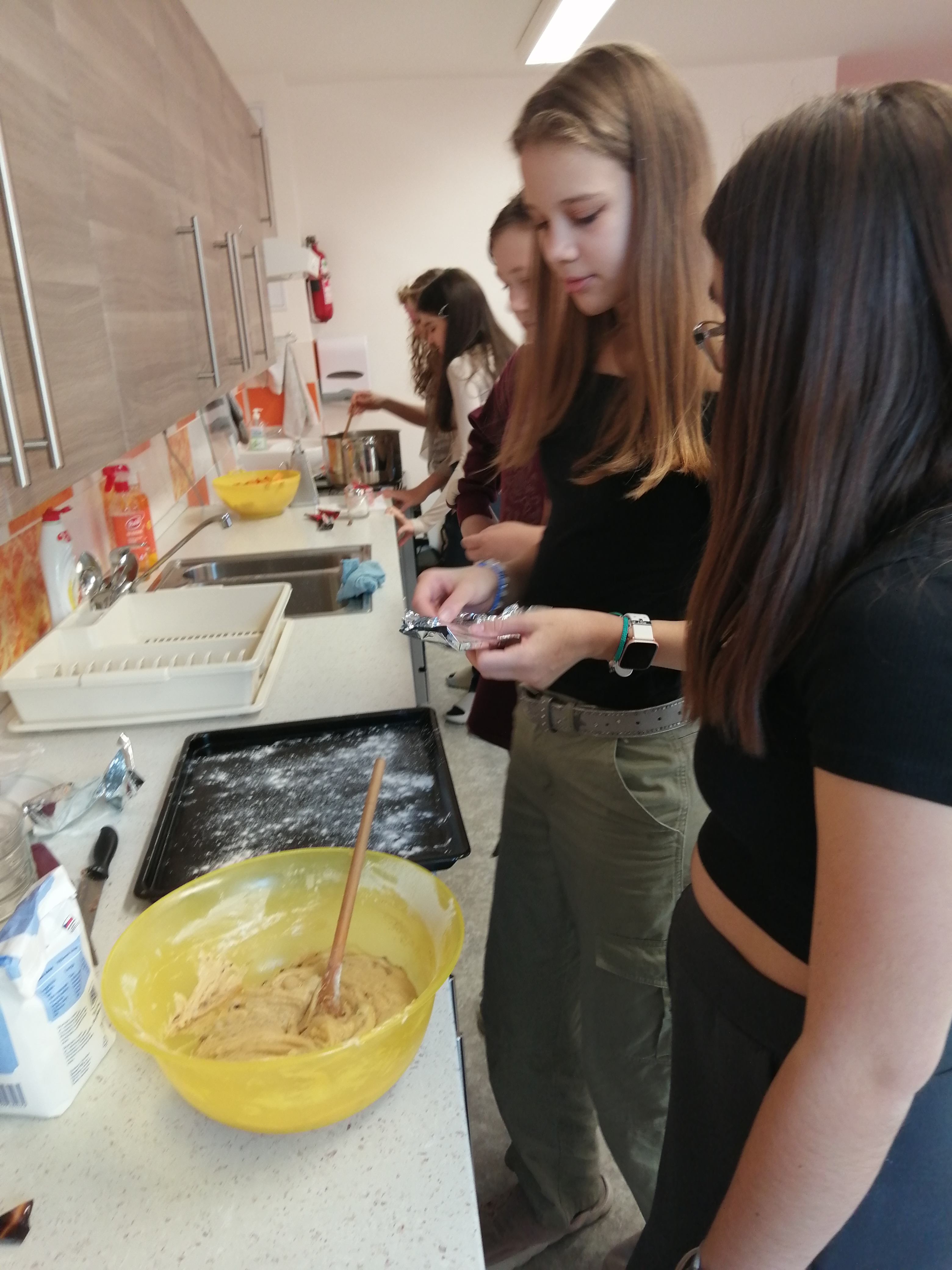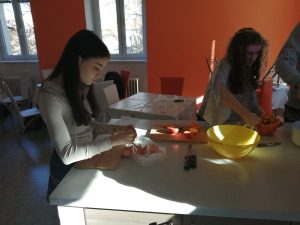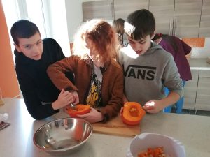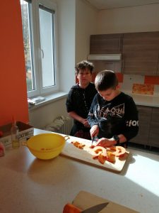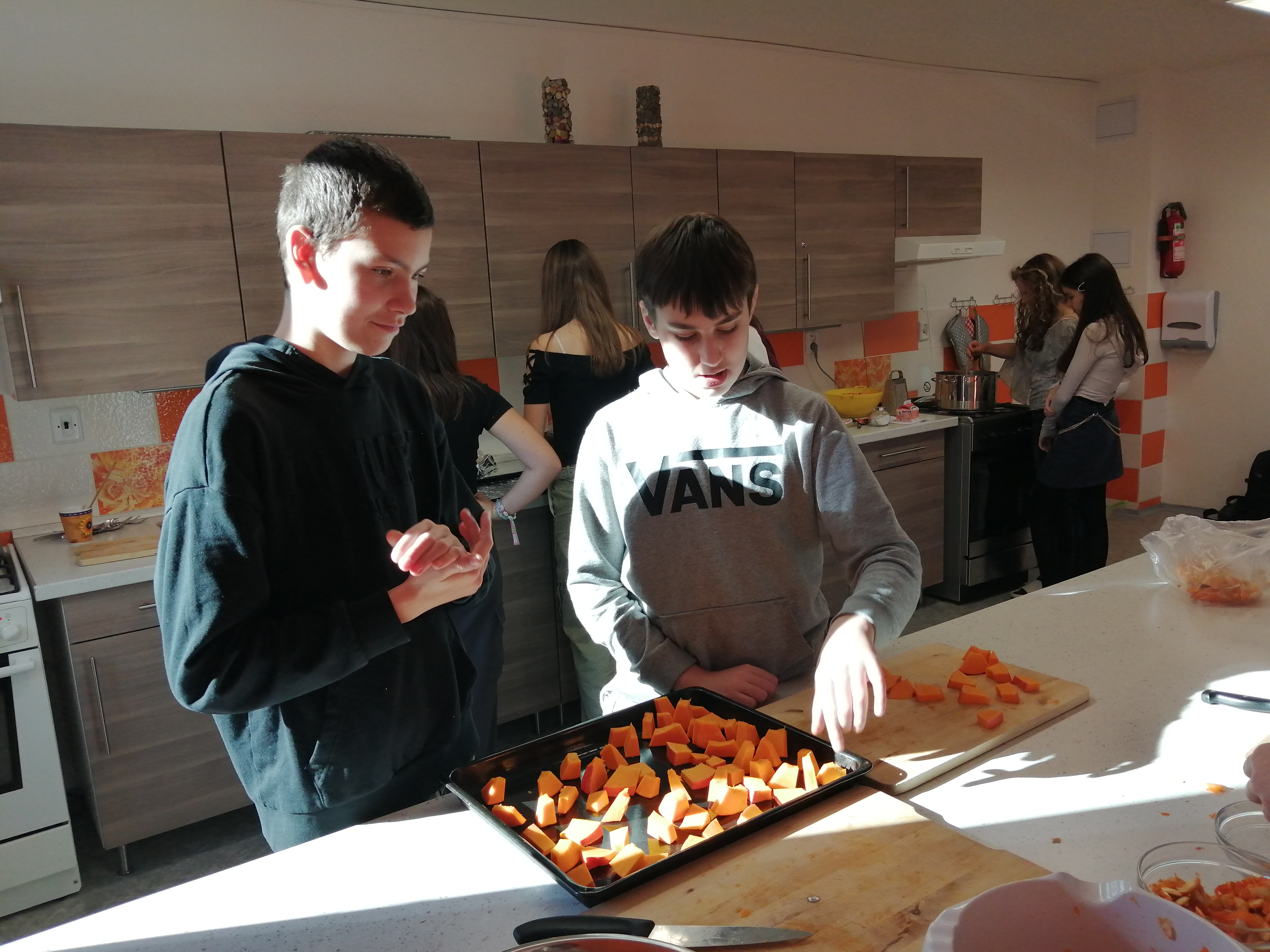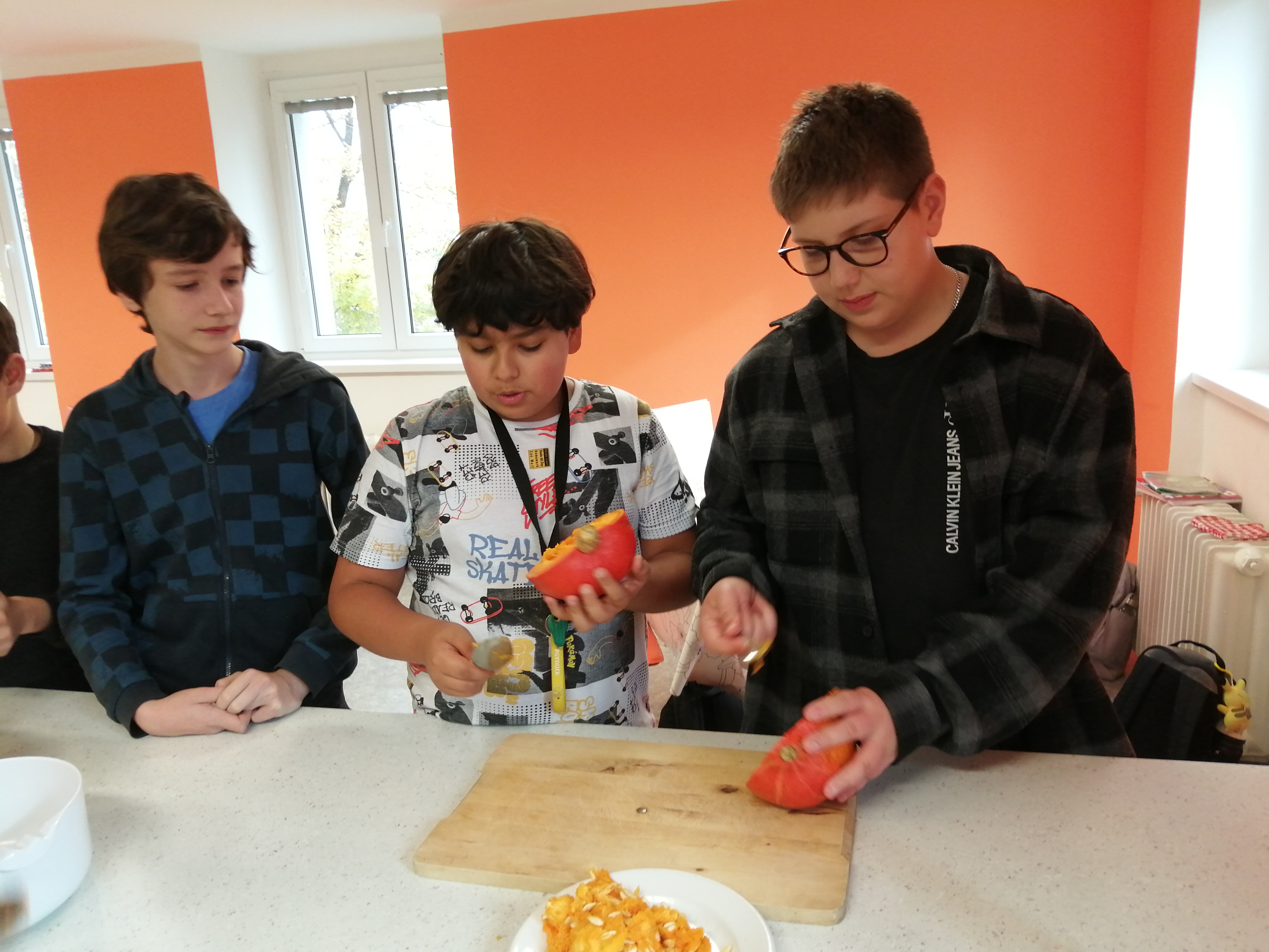 Říjen je měsíc dýní, a proto jsme jako základní surovinu při vaření zvolili právě dýni. Část surovin jsme si vlastnoručně vypěstovali na školní zahradě (ty menší kousky). Žáci sedmých ročníků se při pracovních činnostech rozdělili na 2 skupiny – milovníci dýní a odpůrci dýní. Při tvorbě dýňové polévky a pečené dýně ale pomáhali všichni. Druhá skupina ovšem přišla o skvělý gastronomický zážitek při následné konzumaci pokrmů. Krásně oranžová zelenina nezklamala a vše chutnalo výborně. Jako bonus upekly žákyně 7. A skvělé sušenky, které oranžové menu vhodně doplňovaly. Již teď se těšíme na další téma – vánoční pečení.