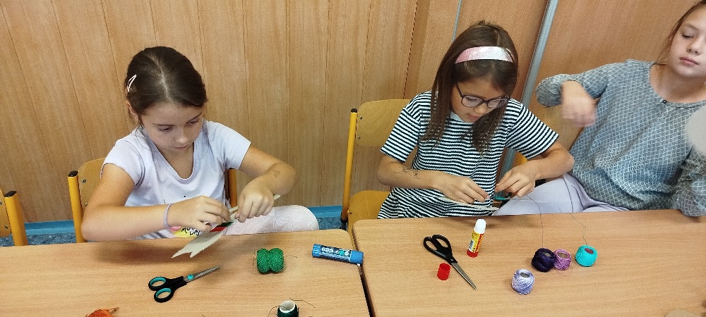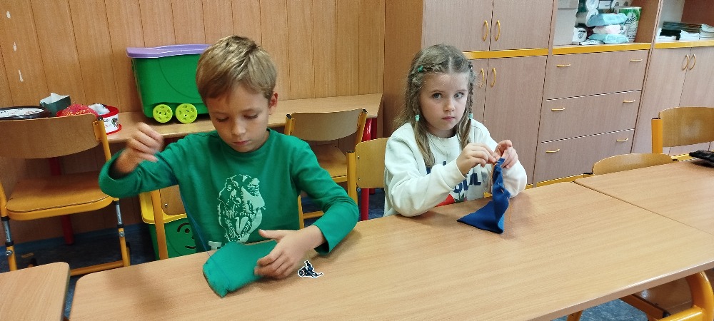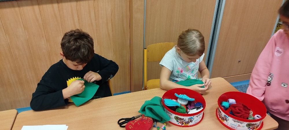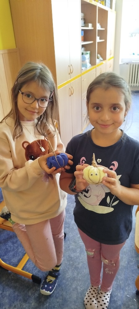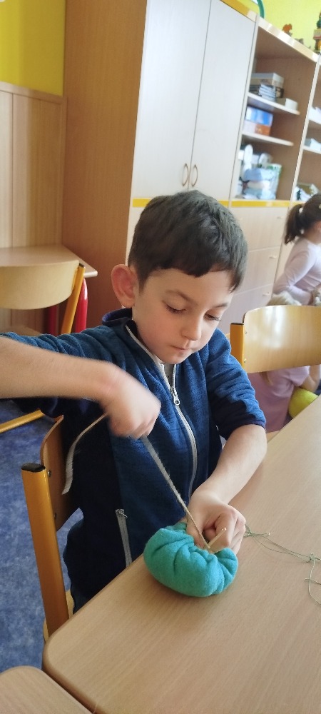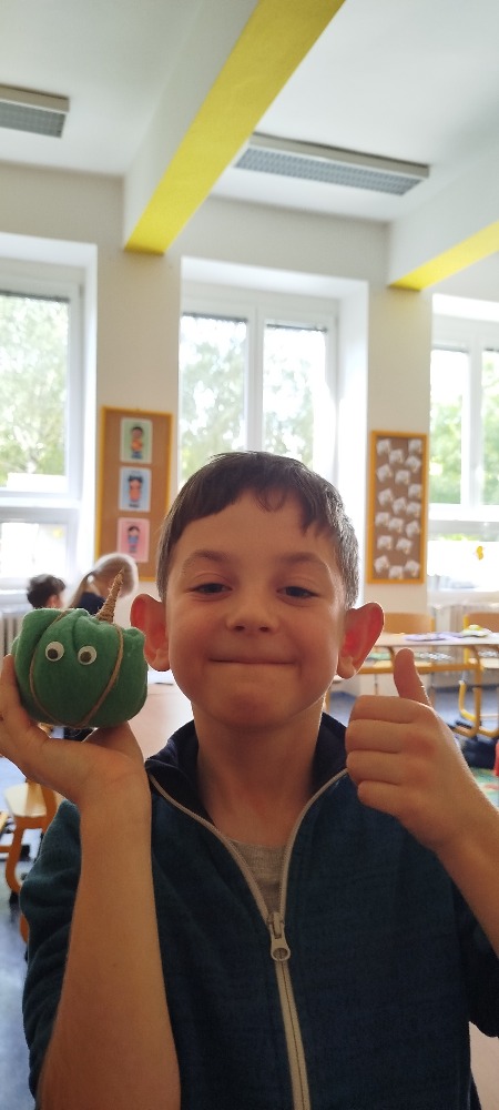 Velkou radost dětem přináší také naše dýňové tvoření z látek. Dýně stříháme, vycpáváme a lepíme – a každá z nich je jedinečná.