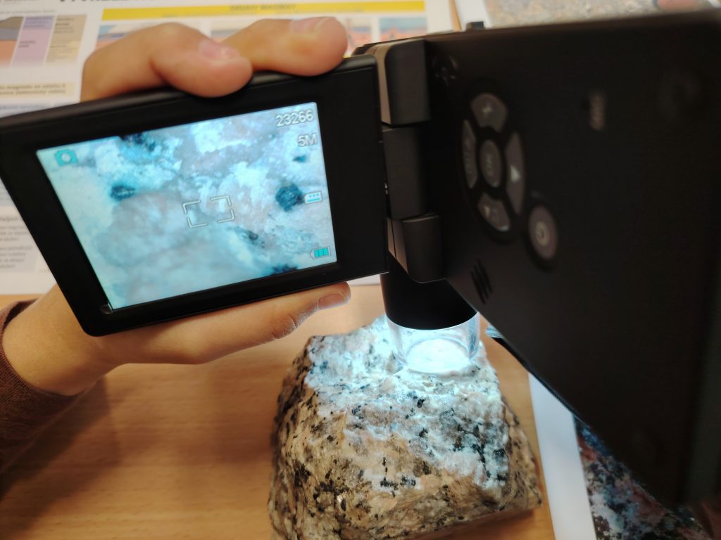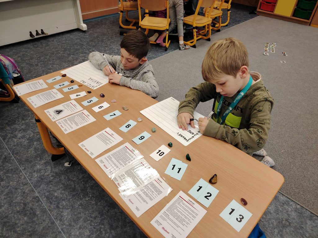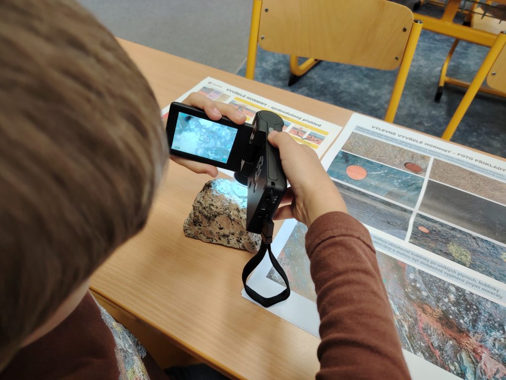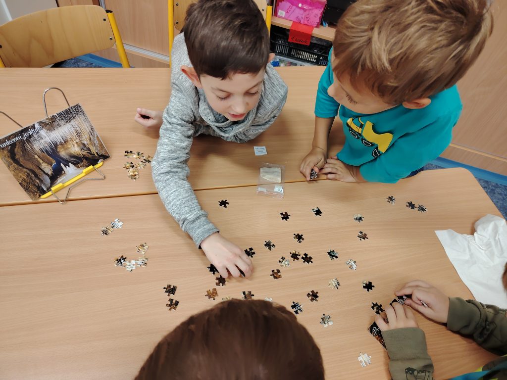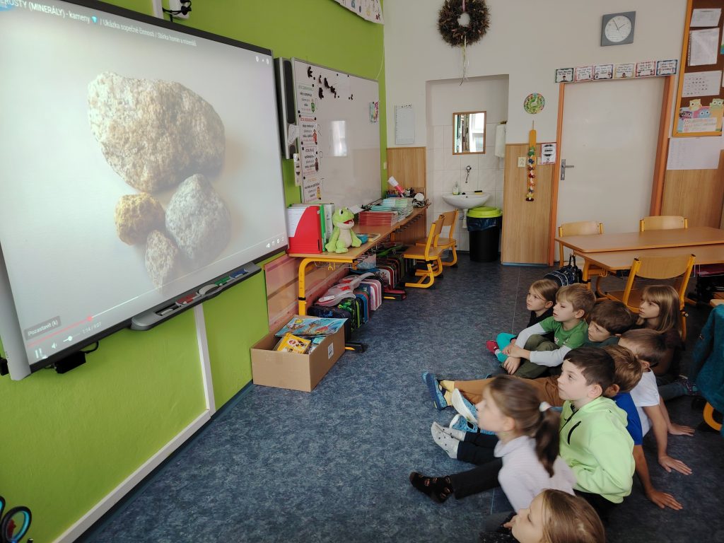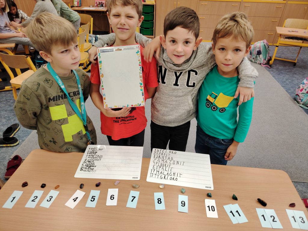V badatelském klubu velmi rádi děláme pokusy, mikroskopujeme, ale také velmi rádi zkoumáme horniny a nerosty. Rádi zjišťujeme, jak vznikly, jak je můžeme určit v přírodě, jaké mají vlastnosti a využití. Nádherné barvy a struktury minerálů nás okouzlují. Hrajeme pexeso s obrázky minerálů, skládáme puzzle Punkevní jeskyně a určujeme minerály. Sledujeme videa o vzniku hornin, a pak se vzorky snažíme určit dle znaků. Prostě je to nádherný, zajímavý a kouzelný svět „kamenů“.