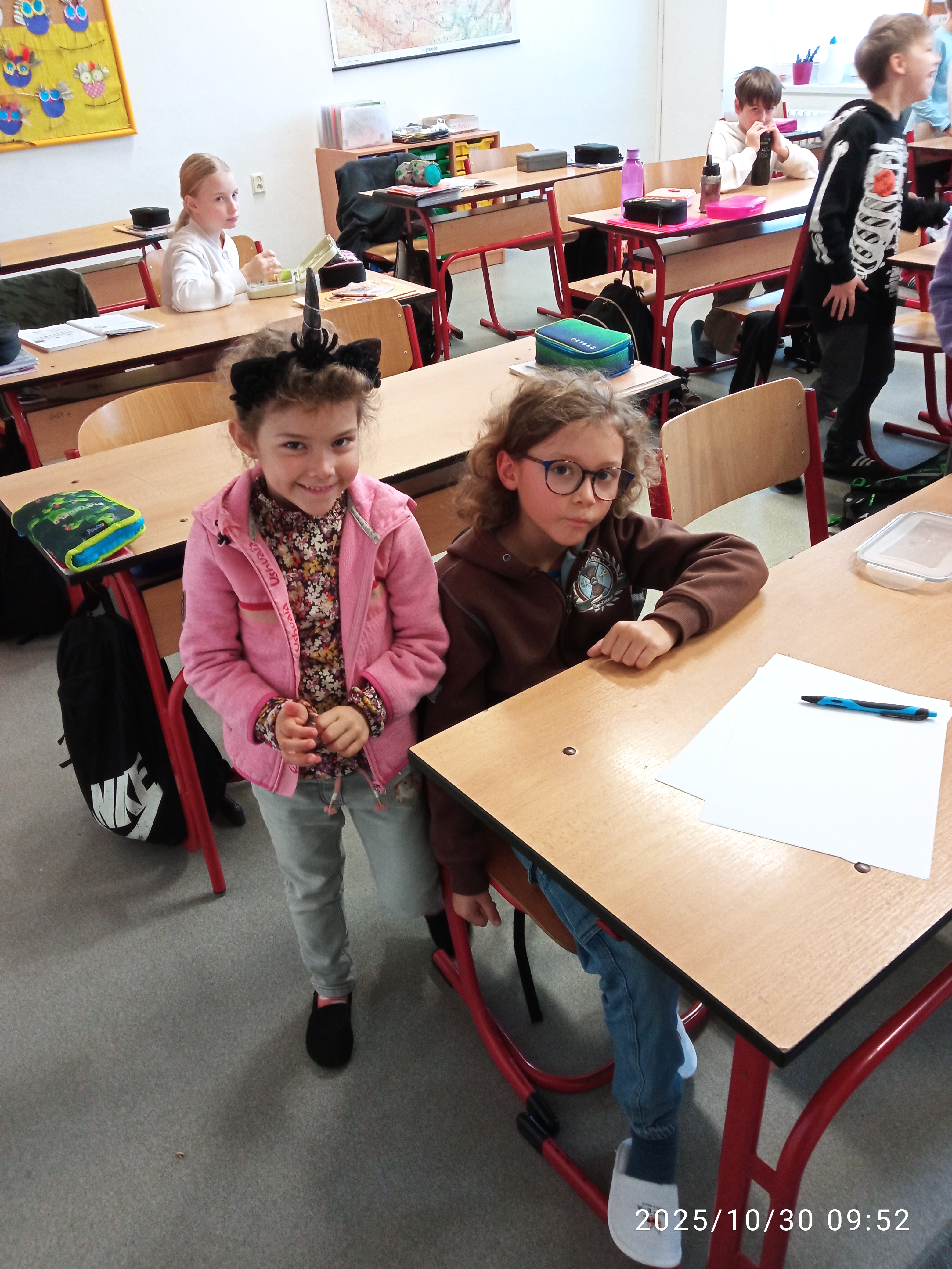 Po podzimních prázdninách nás navštívily dvě francouzské děti, které tady tráví prázdniny. Učily se se svými vrstevníky v 1. a 5. třídě. Prvňačka Valentine rovněž měla prostor ke konverzaci s žáky 7. – 9. ročníku, kteří se učí francouzštinu jako volitelný předmět.