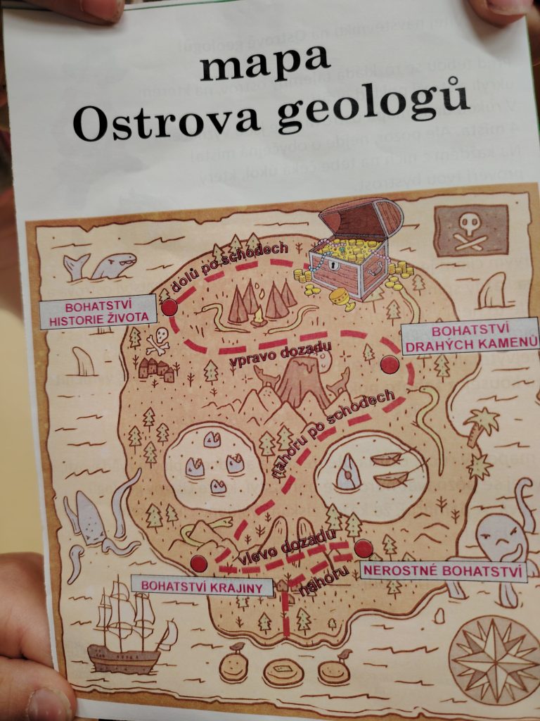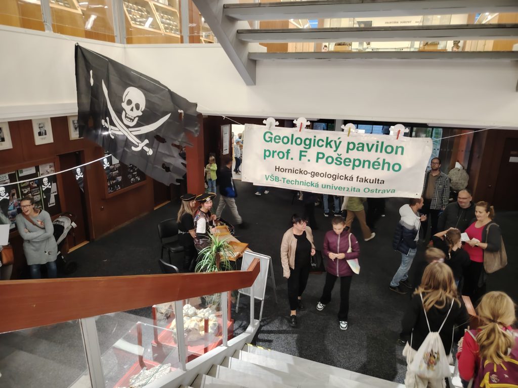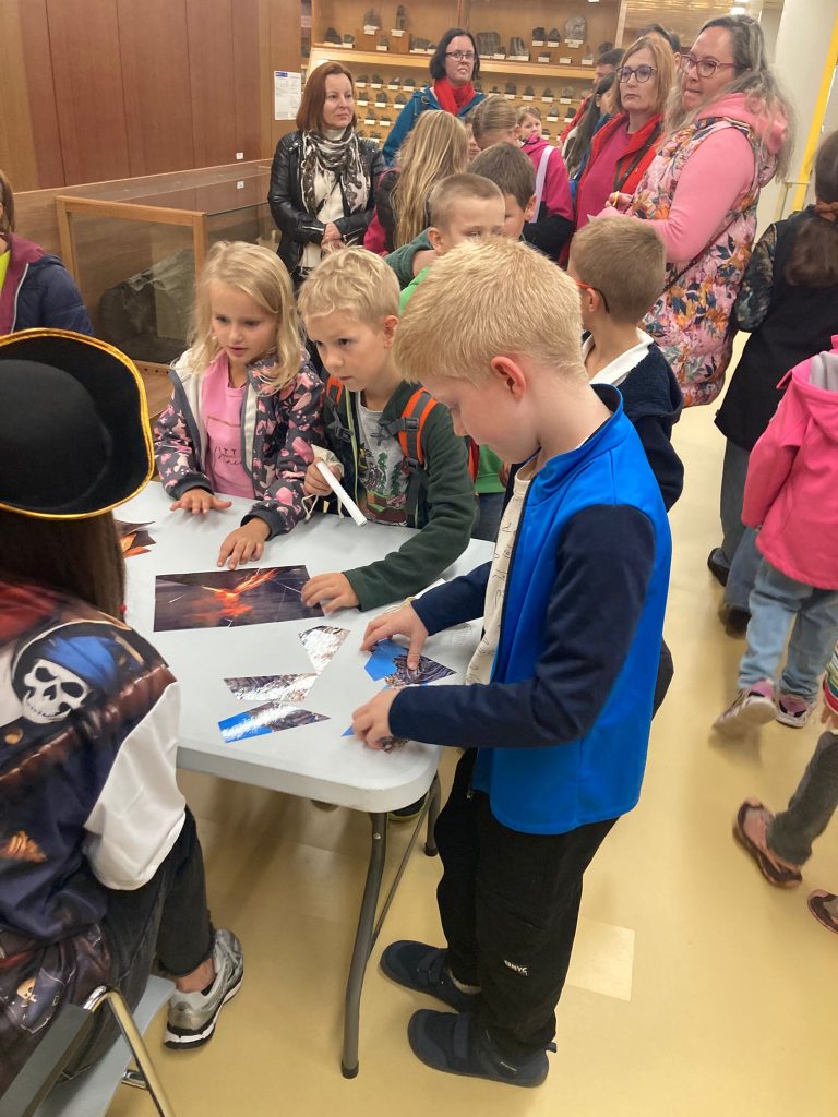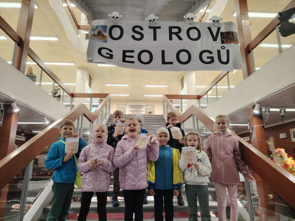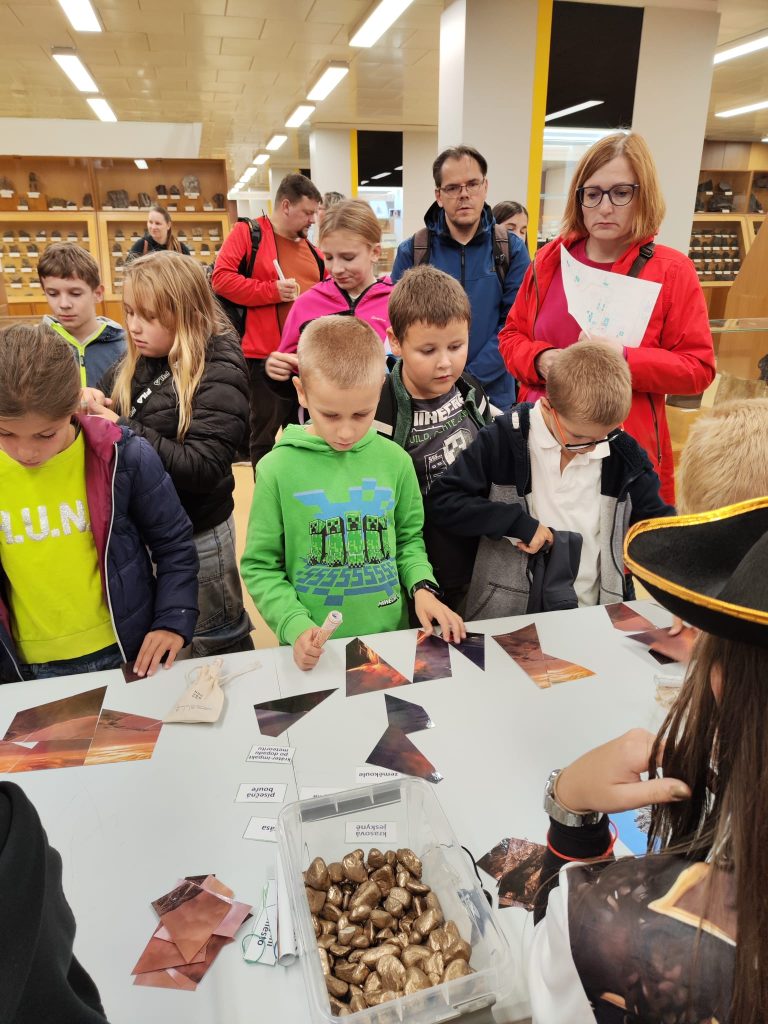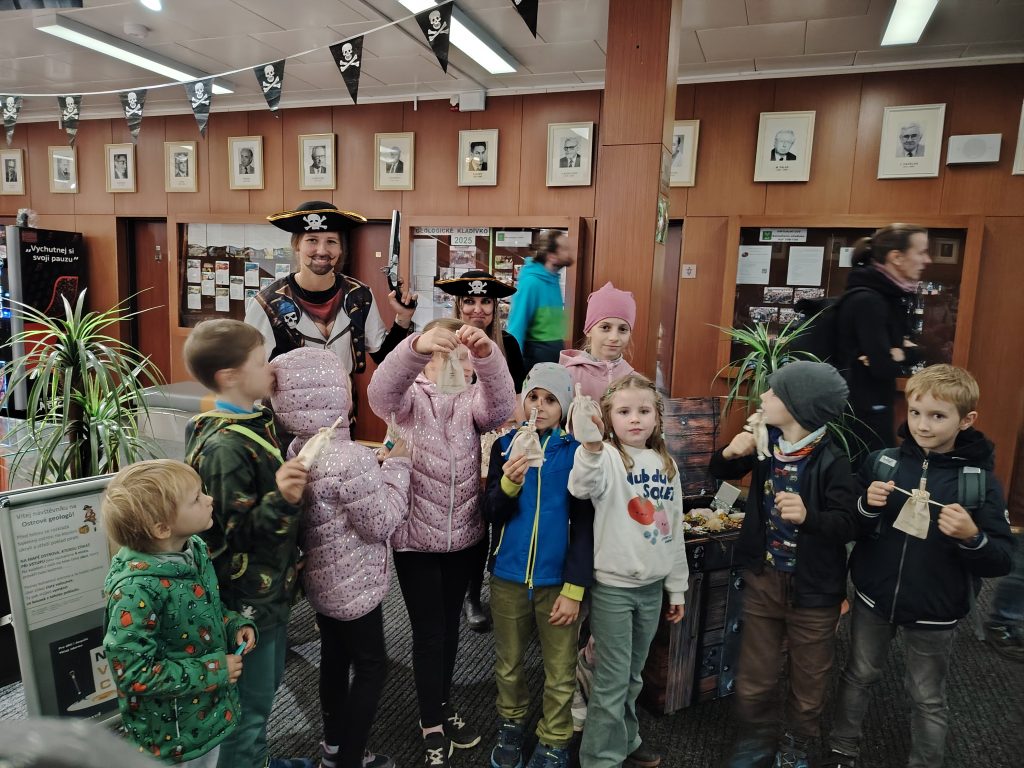 V pátek 26.9.2025 jsme se společně s dětmi a rodiči vydali na Geologickou fakultu VŠB, kde děti viděly nejen spoustu zajímavých věcí, ale mohly si toho i mnoho vyzkoušet. Nejprve je přivítali piráti, kteří jim předali mapu k pokladu. Děti na čtyřech stanovištích skládaly puzzle, určovaly jména minerálů, vyhledávaly je mezi exponáty, určovaly minerály a přiřazovaly výrobky, které jsou z nich vytvořeny.