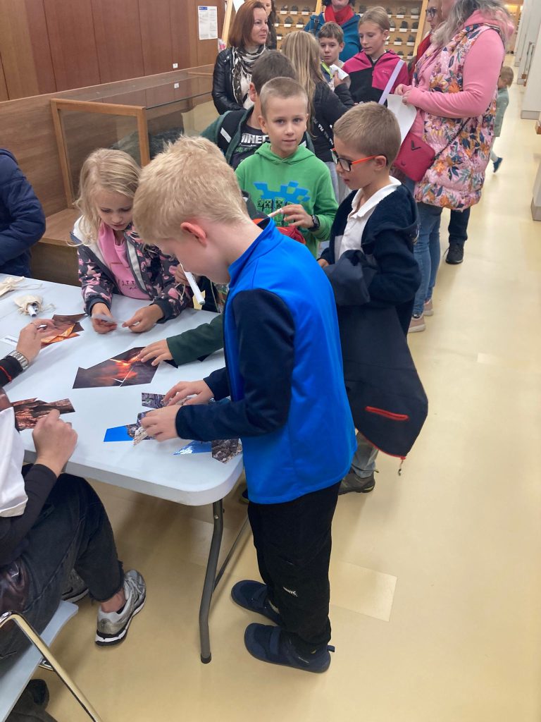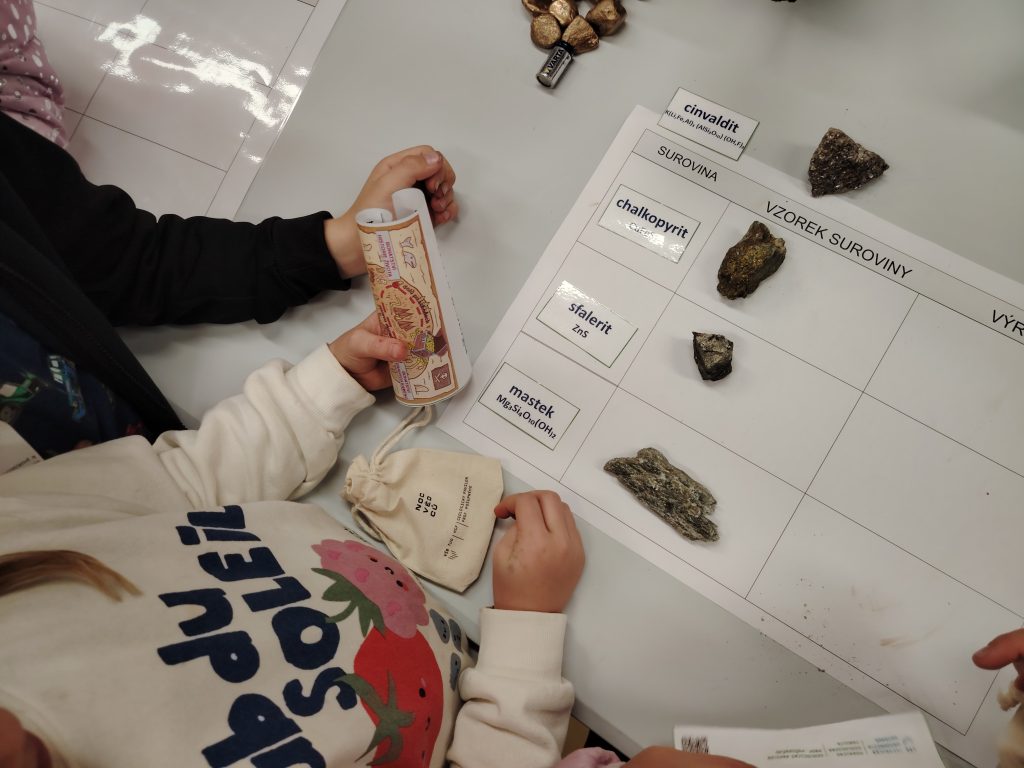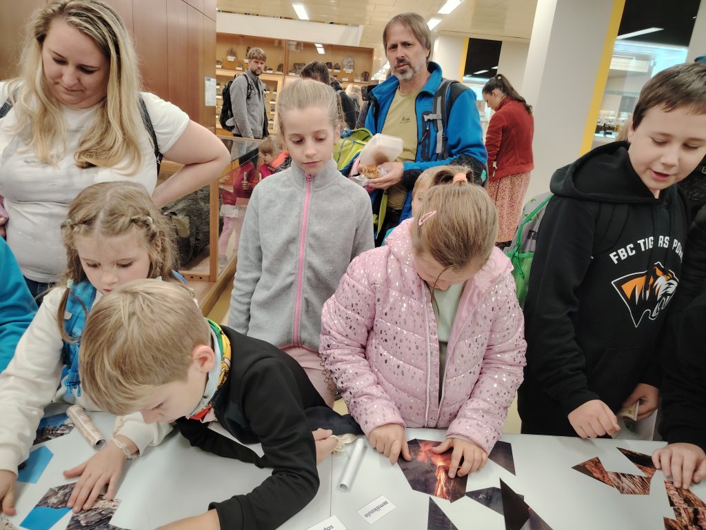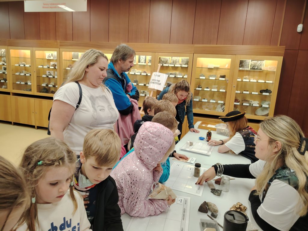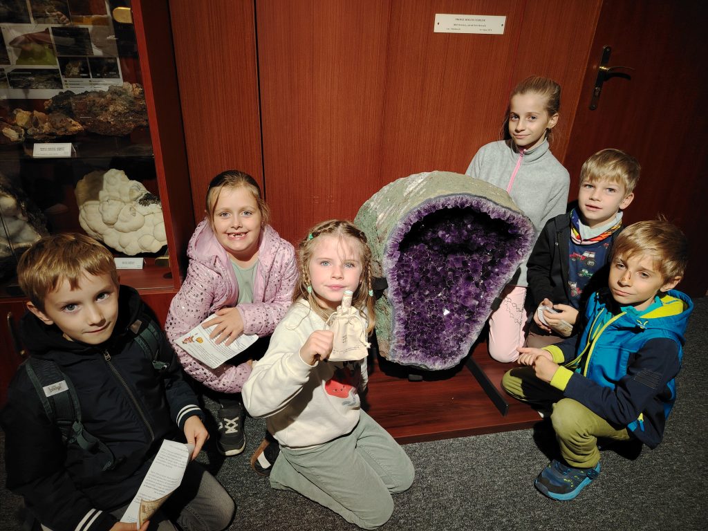 V pátek 26.9.2025 jsme se společně s dětmi a rodiči vydali na Geologickou fakultu VŠB, kde děti viděly nejen spoustu zajímavých věcí, ale mohly si toho i mnoho vyzkoušet. Nejprve je přivítali piráti, kteří jim předali mapu k pokladu. Děti na čtyřech stanovištích skládaly puzzle, určovaly jména minerálů, vyhledávaly je mezi exponáty, určovaly minerály a přiřazovaly výrobky, které jsou z nich vytvořeny.