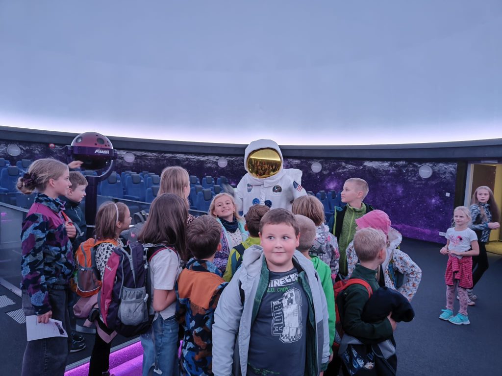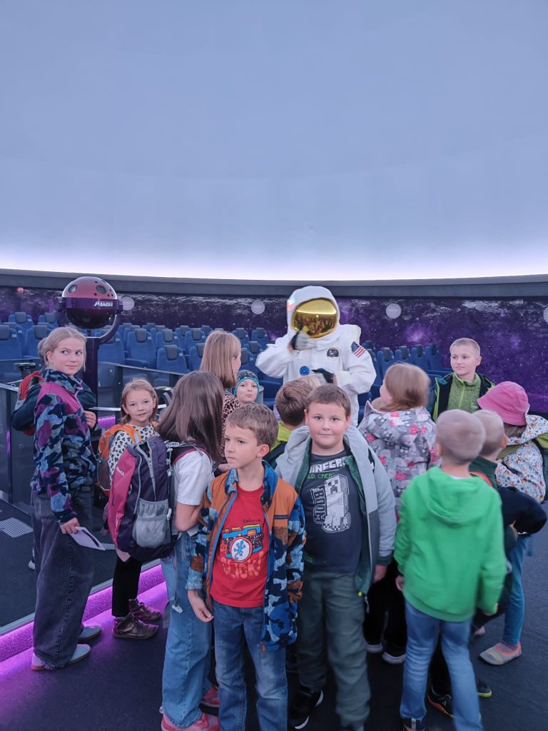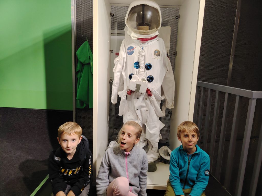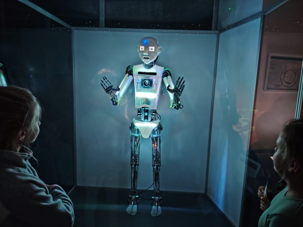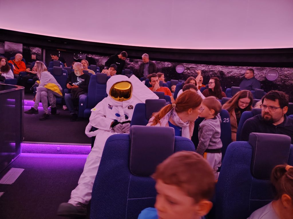 Bylo toho mnoho, co šlo ještě vyzkoušet, ale my jsme se přesunuli do planetária, abychom zhlédli ukázky výukových filmů ve sférickém planetáriu. Moc nás také potěšilo setkání s robotem Engiem, kterého známe z výukového videa.