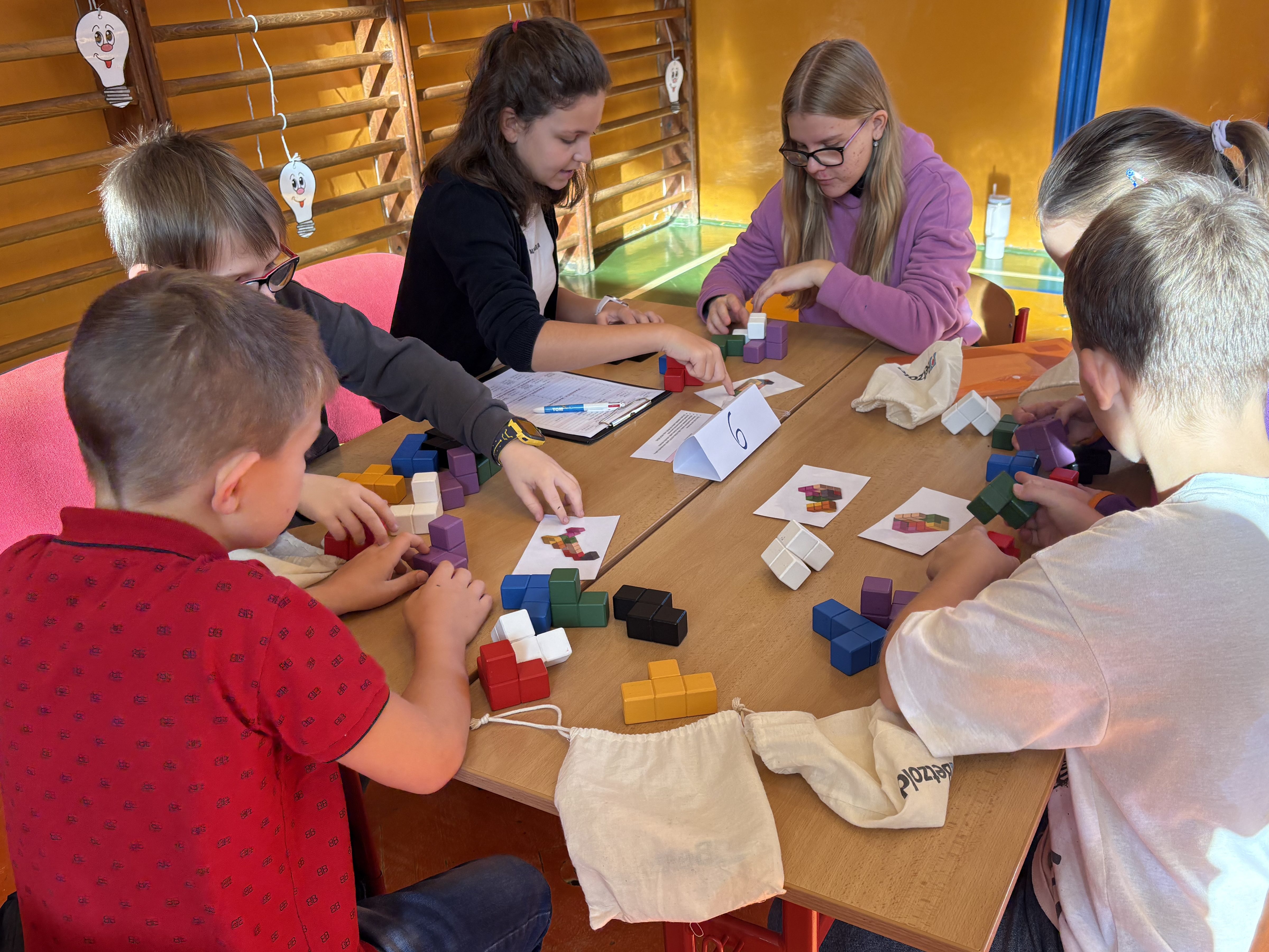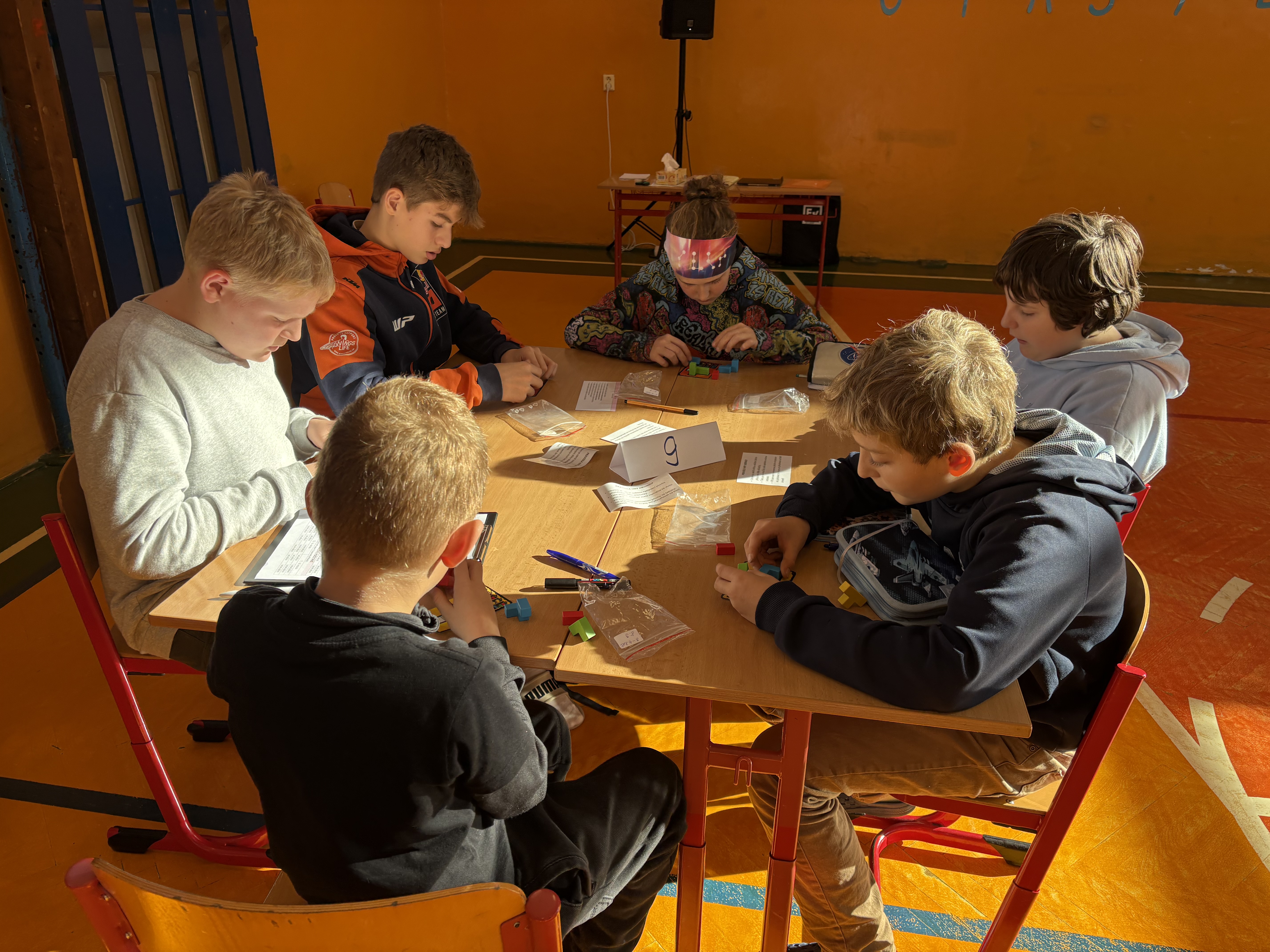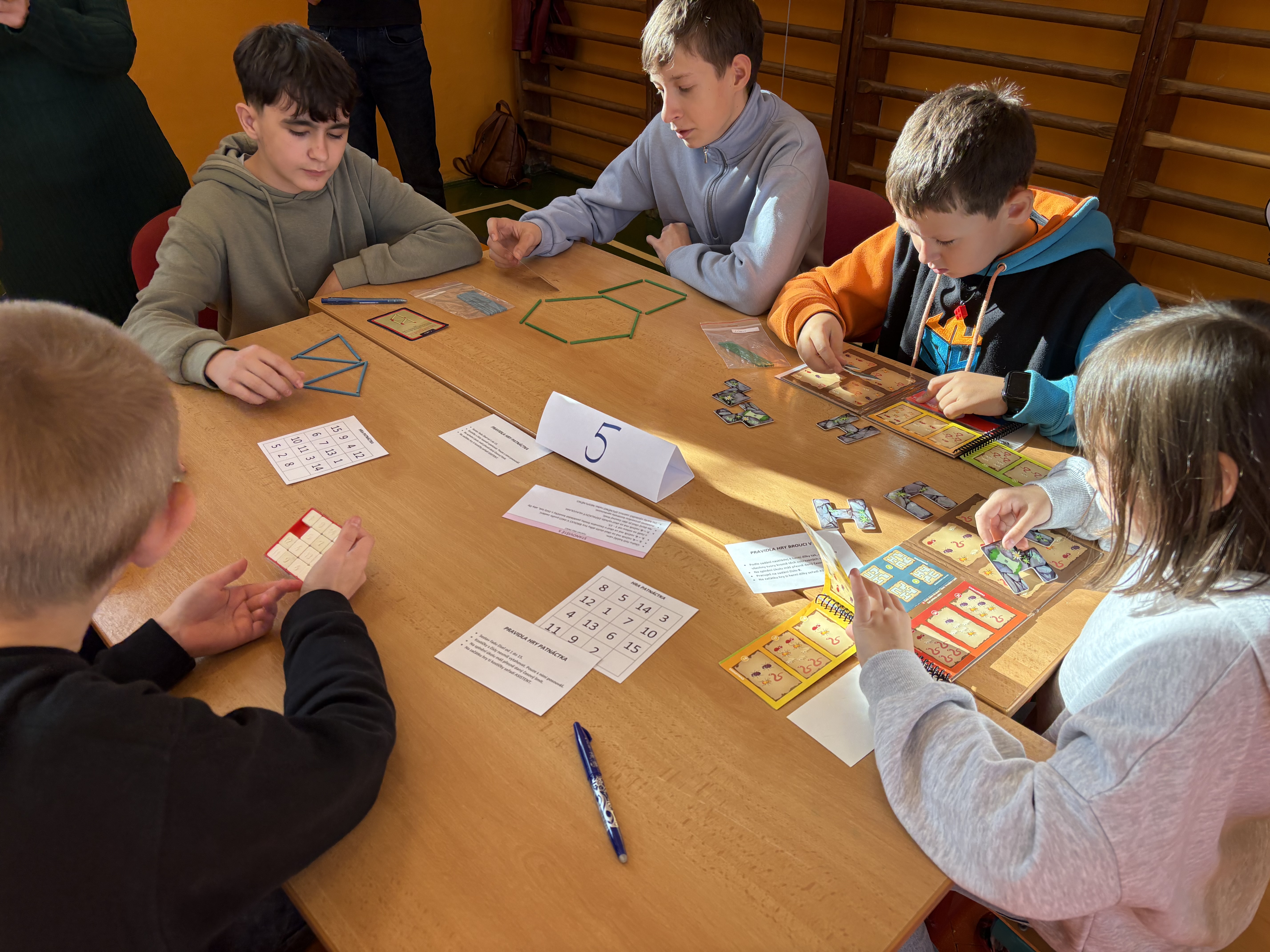 Týmy se během dopoledne musely poprat s různými úkoly na deseti stanovištích. Úkoly byly pestré a zábavné – děti skládaly Soma kostky, luštily hádanky, řešily tangramy a obrázkové příklady, vyzkoušely si i Kimovku a mnohé další.