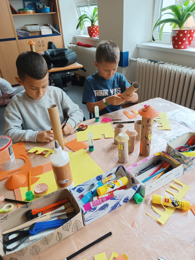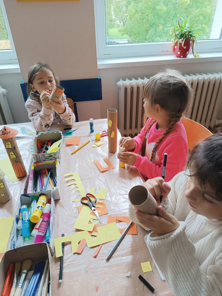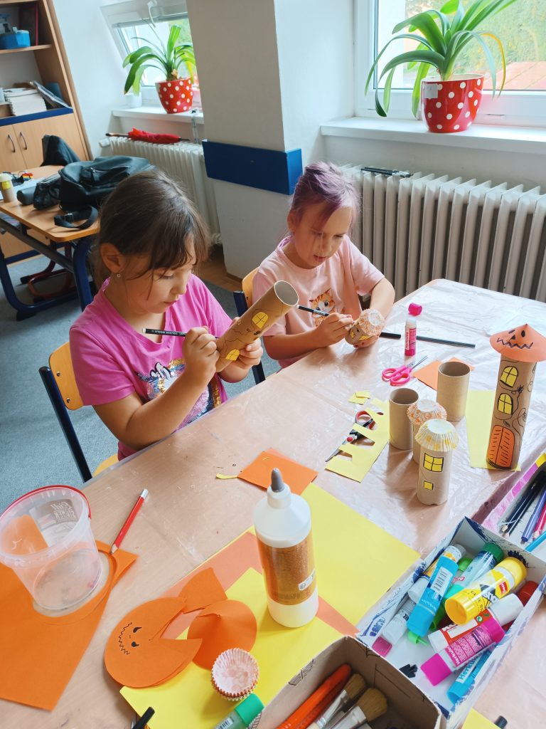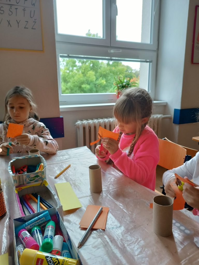 Na podzim využíváme volný čas hlavně na školním hřišti v krásné barevné přírodě při pohybových hrách, ale také rádi vyrábíme. Zaměřili jsme se na podzimní svátky Helloweenu a naši žáci si vyrobili krásné výrobky.