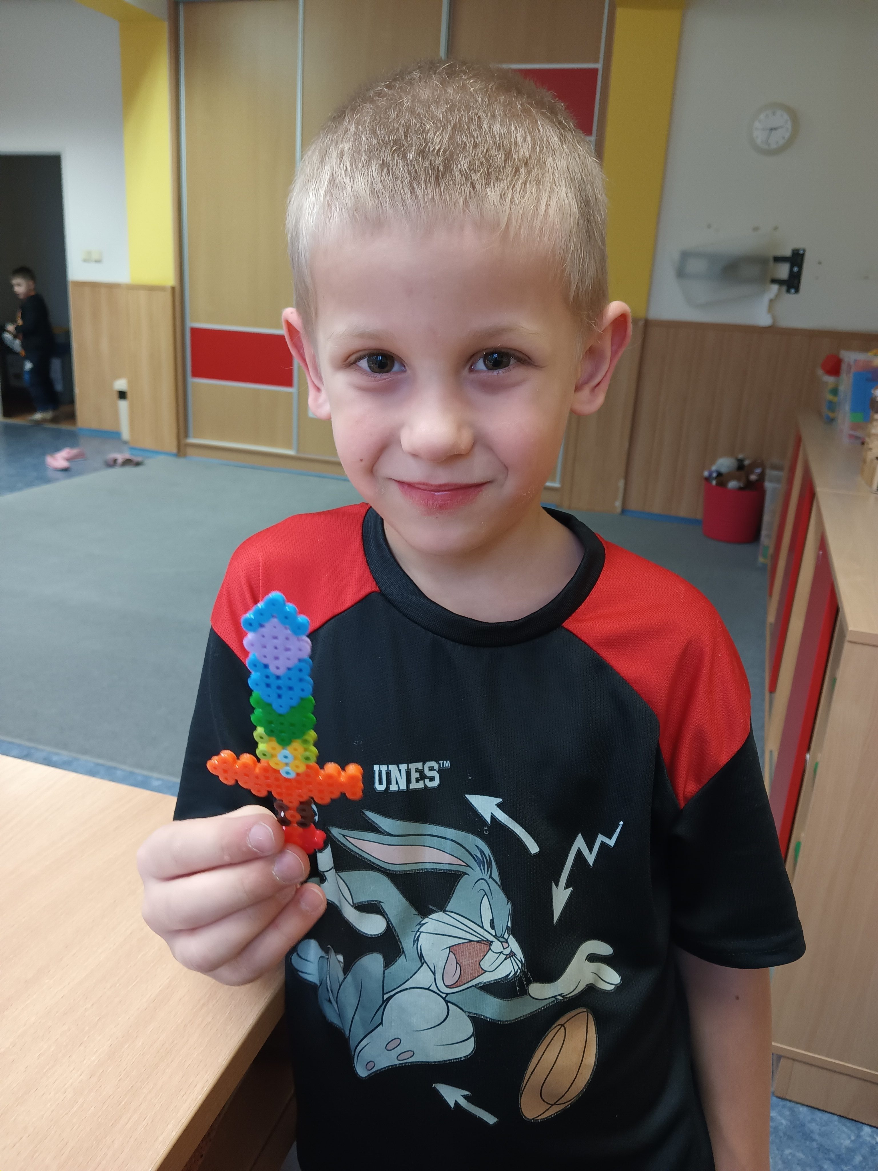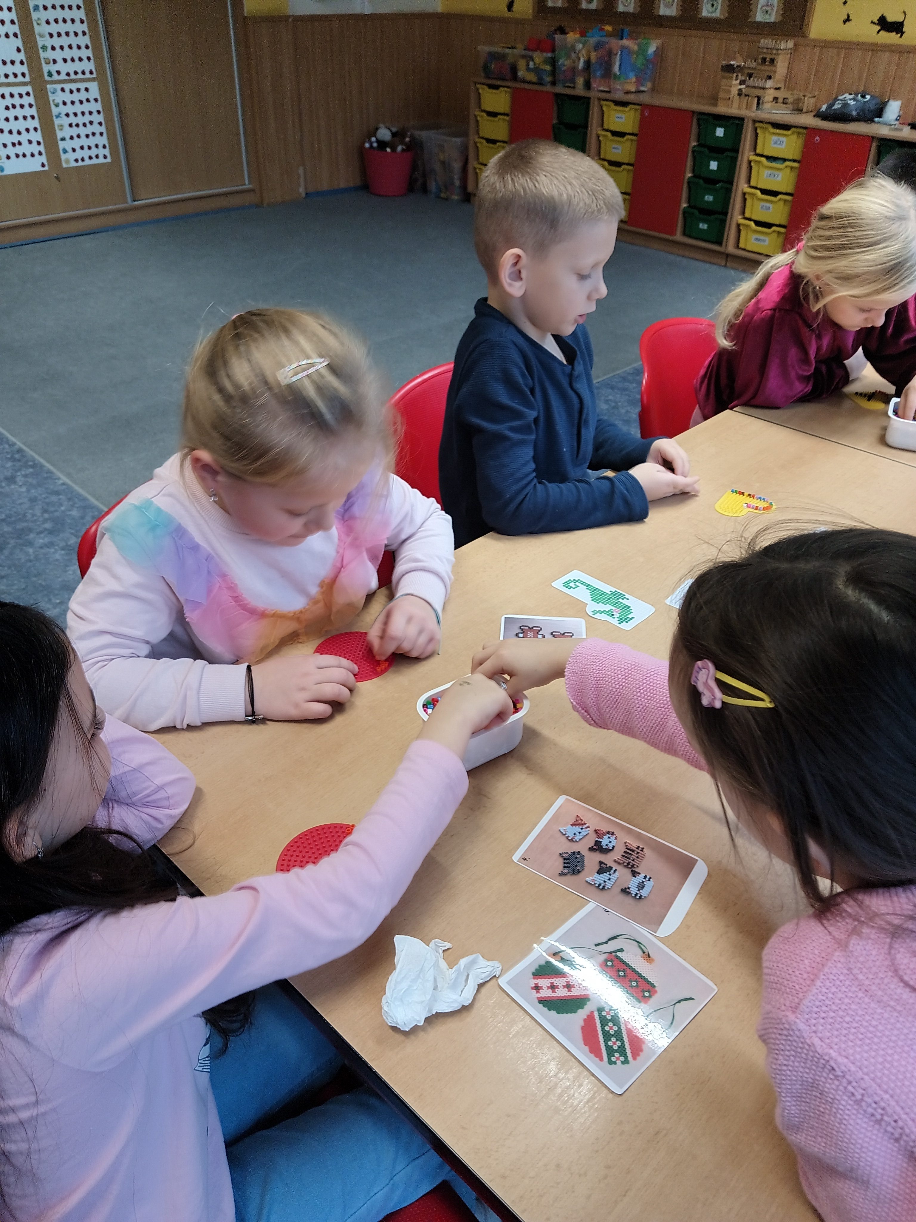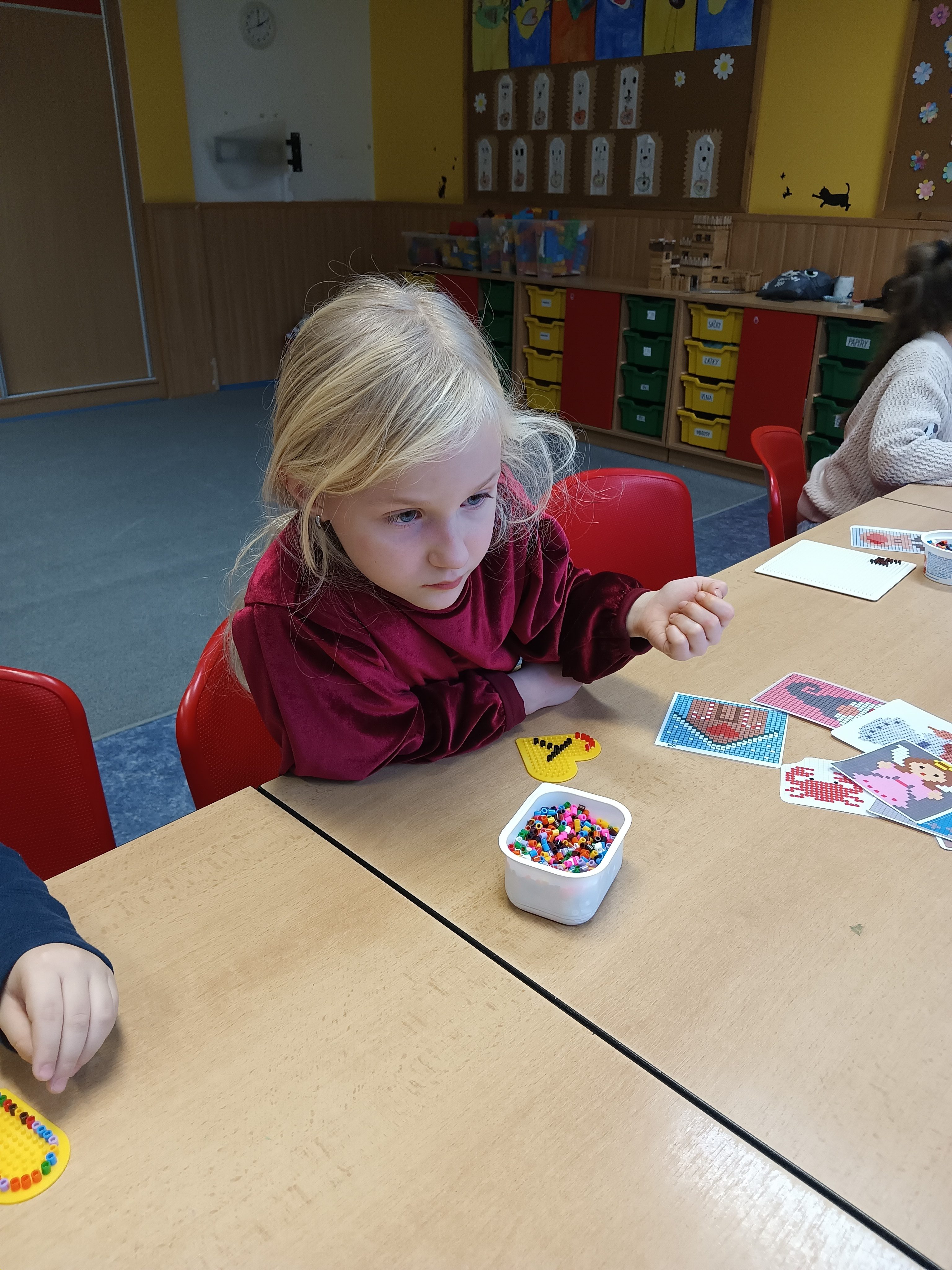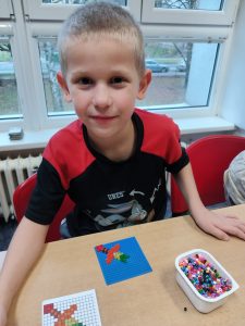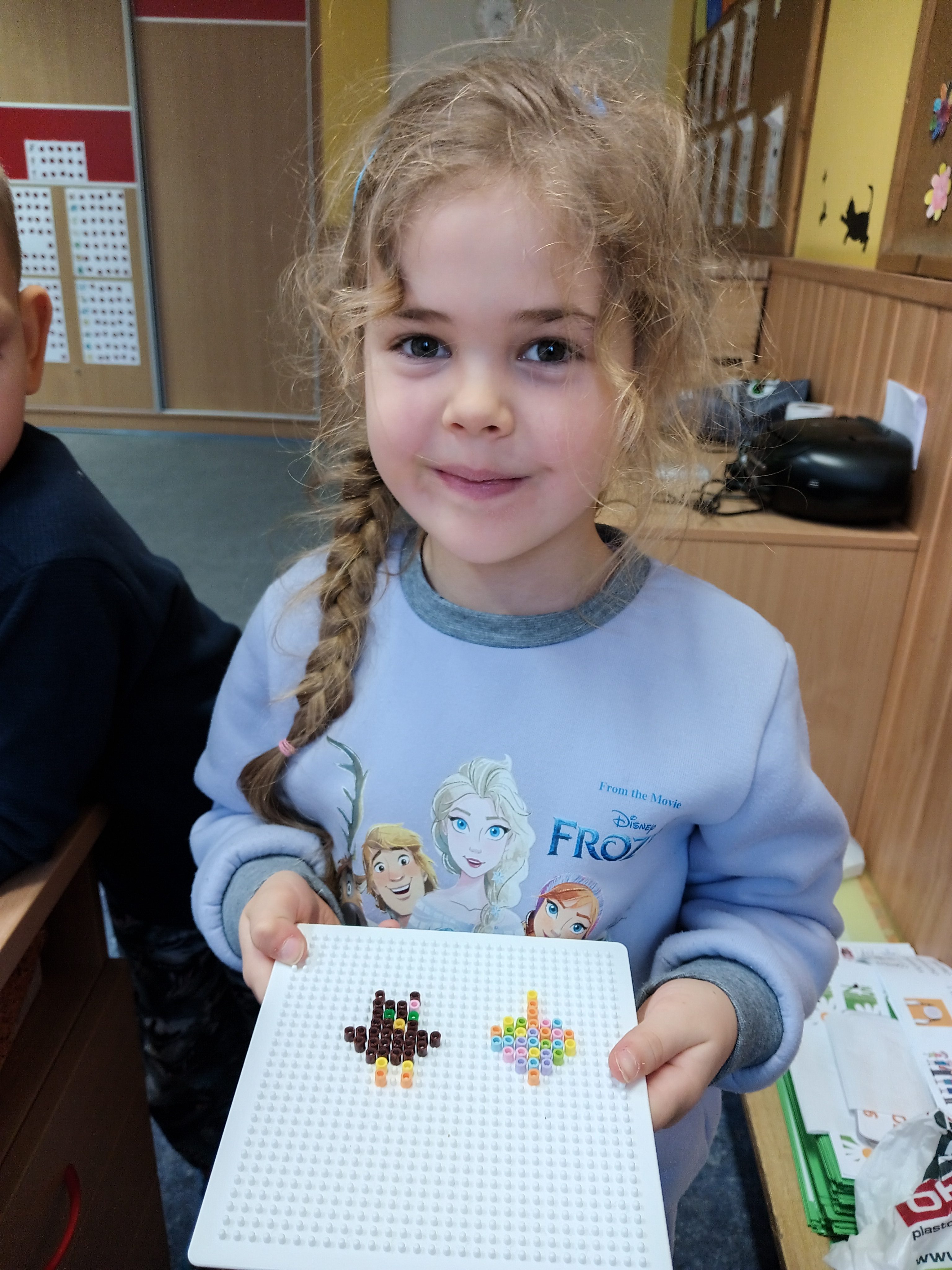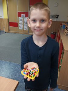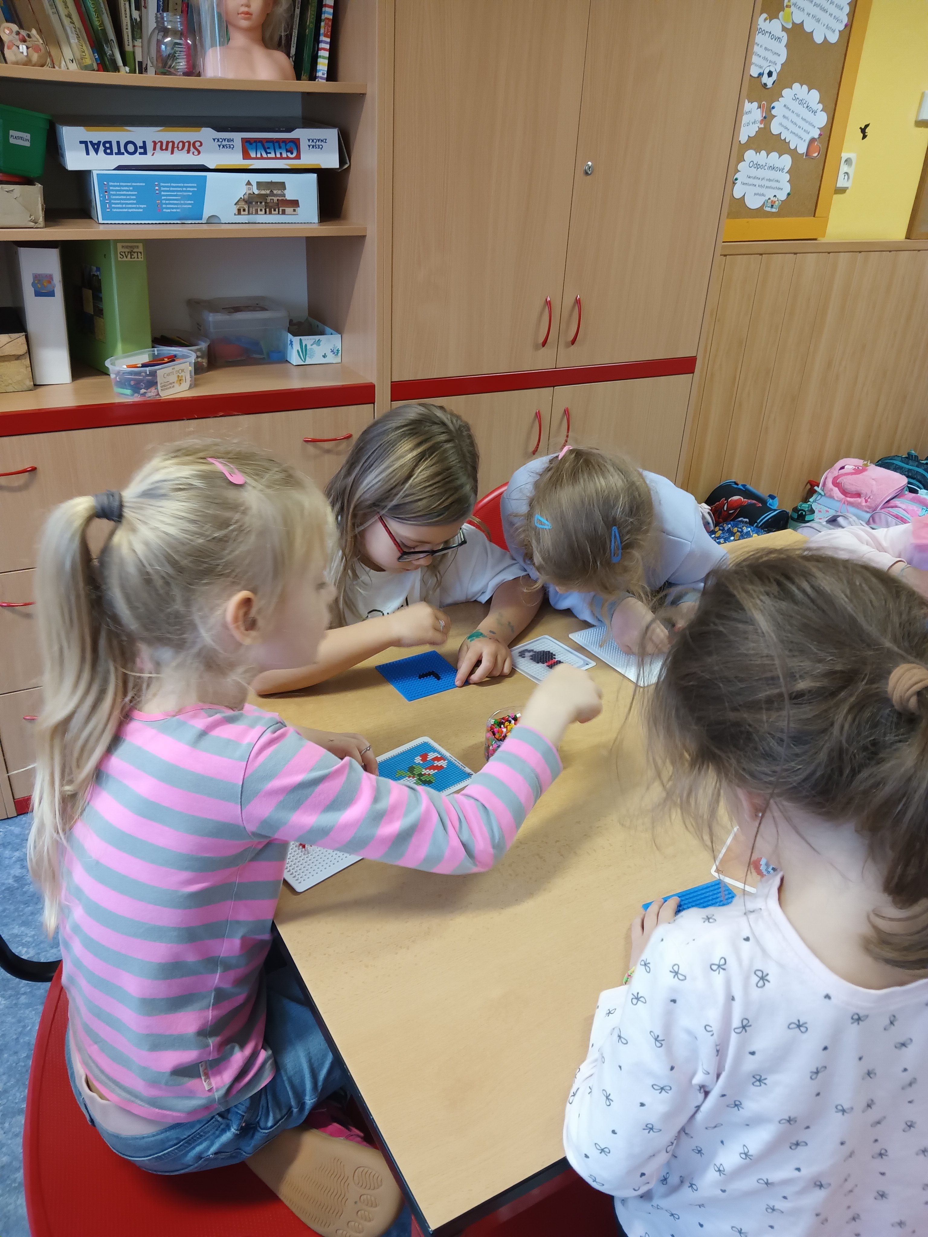 V oddělení Berušek vypuklo doslova korálkové šílenství. Všechny děti propadly kouzlu barevných korálků a s velkým nadšením vytvářely obrázky – některé podle předlohy, jiné zcela podle vlastní fantazie. Hotové výtvory jsem dětem přežehlila, aby si je mohly odnést domů a uchovat jako milou památku.