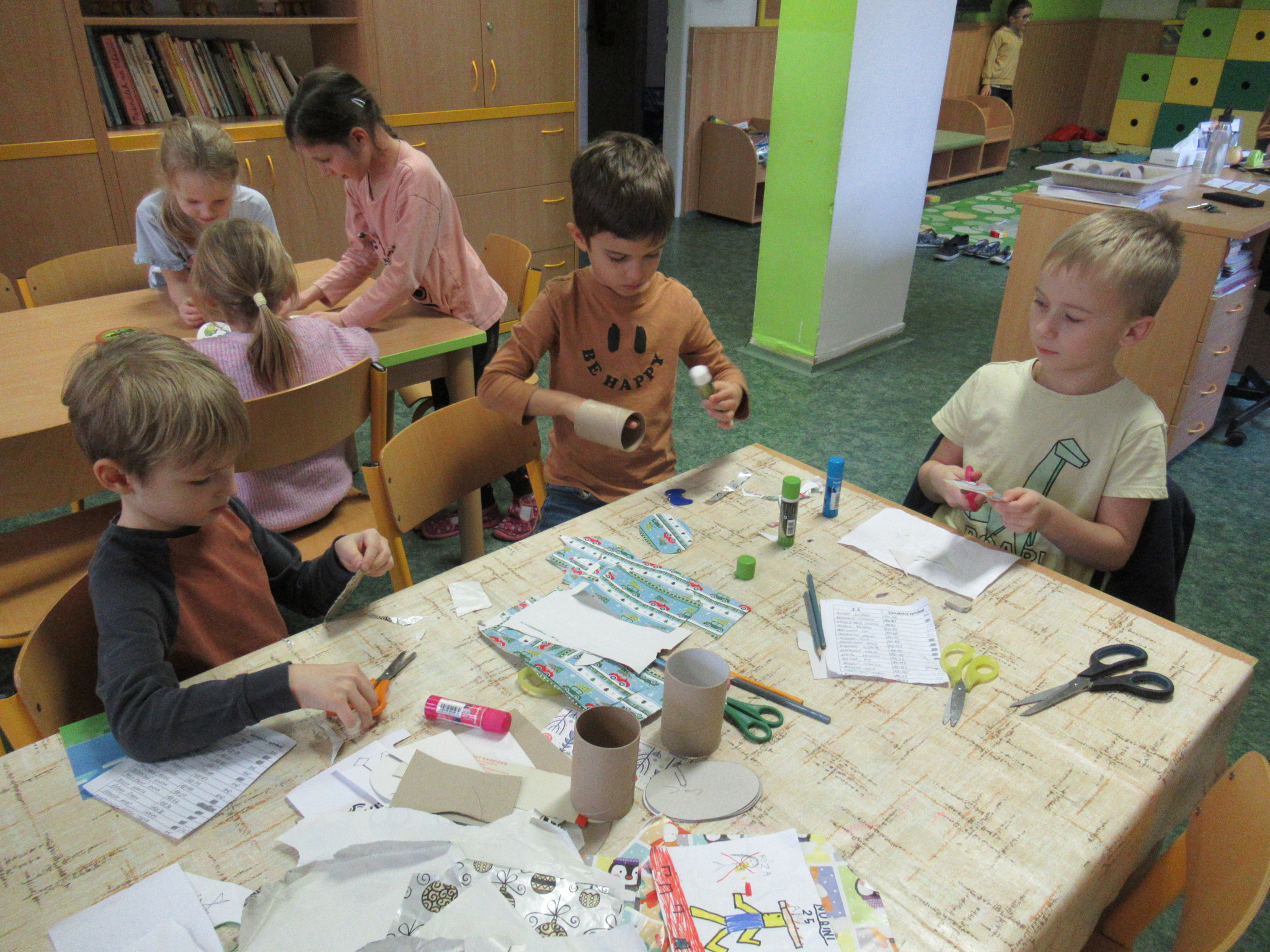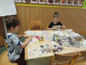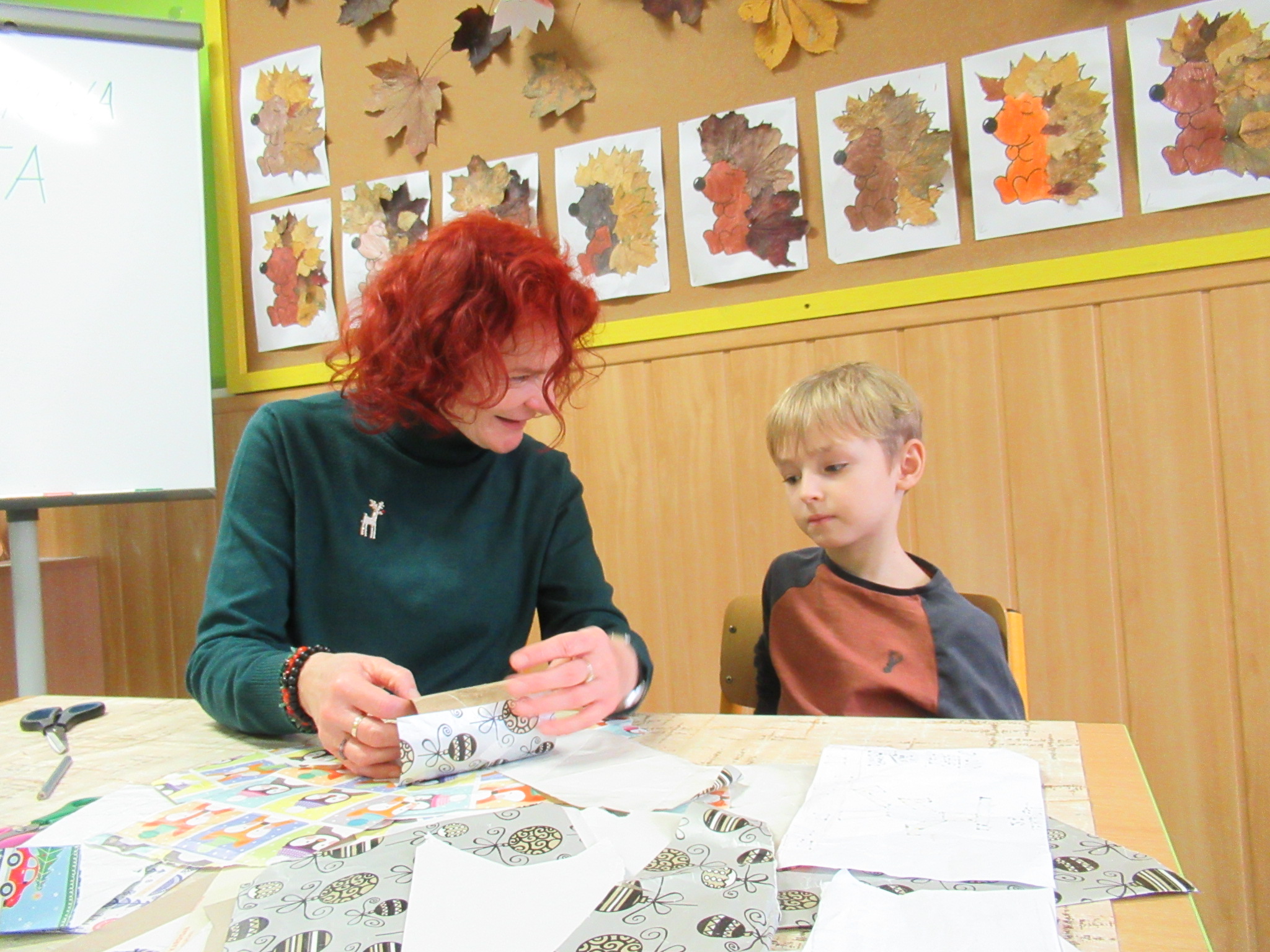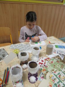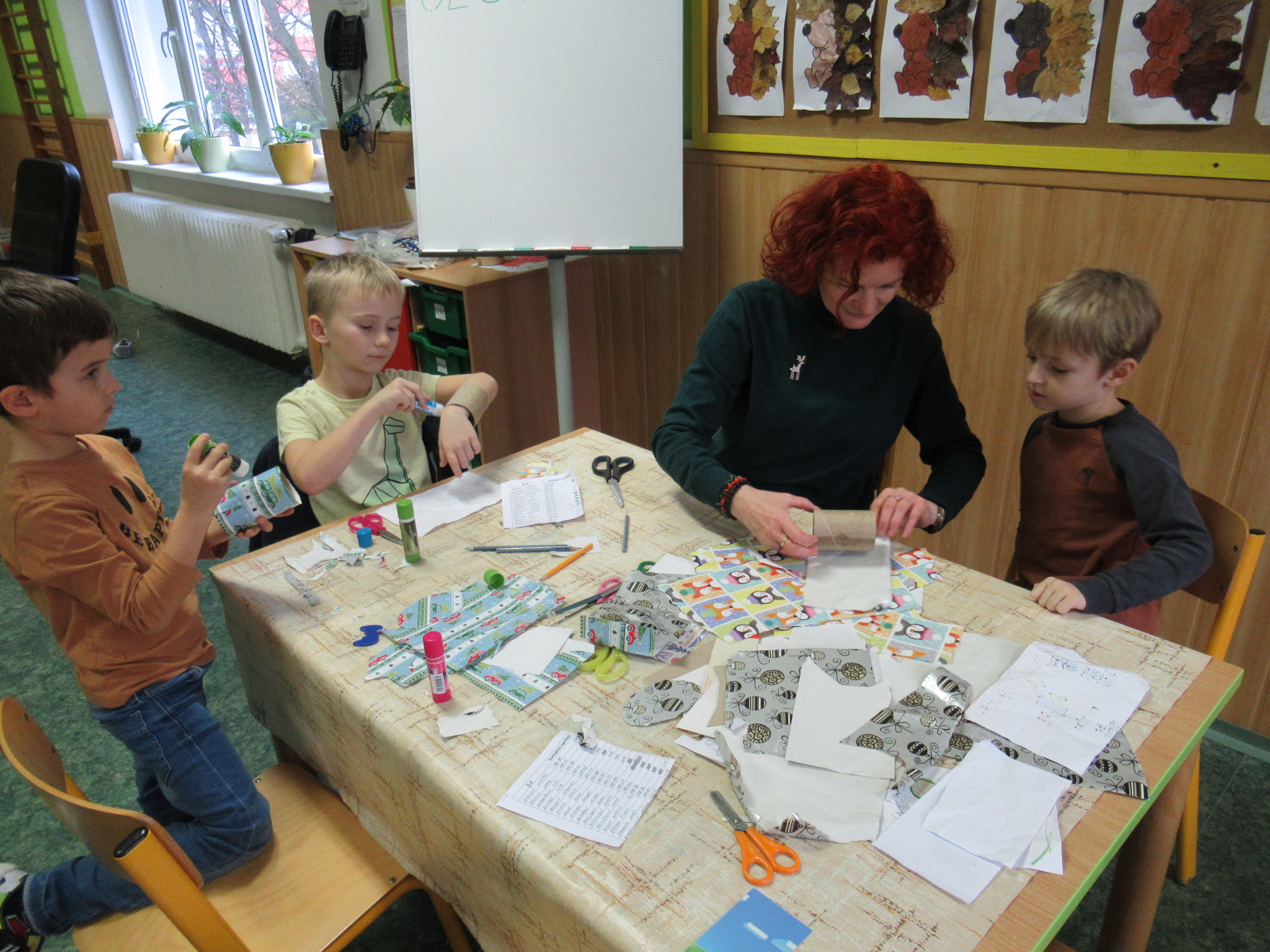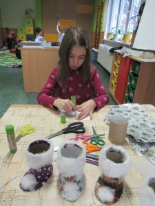 V našem oddělení jsme se s dětmi pečlivě připravovali na tradiční mikulášskou nadílku. Děti si vyrobily své vlastní mikulášské botičky z ruliček od toaletního papíru. Nejdříve je obalily vánočním papírem. Každý si vybral papír, který se mu nejvíce líbil. Poté děti vystřihly a obalily spodek botičky. Jednotlivé části slepily k sobě a postupně tak vznikla krásná botička připravená na sladké překvapení. Paní vychovatelka všechny botičky ještě dozdobila vatou. Vytvořila lem a malou bambulku, čímž botičky získaly slavnostní vzhled. S netrpělivostí pak děti čekaly na příchod Mikuláše s čertem a jeho družinou.