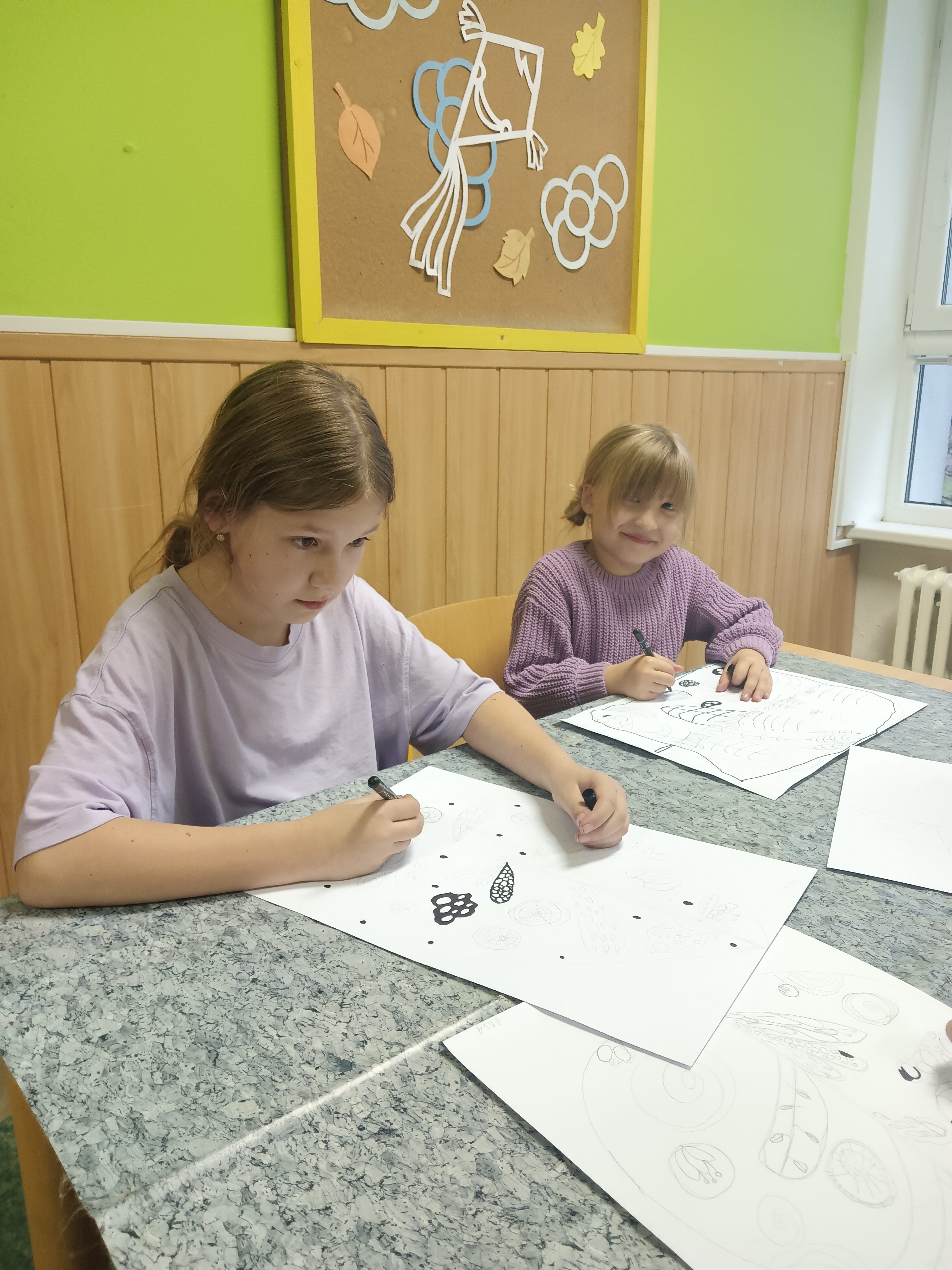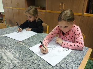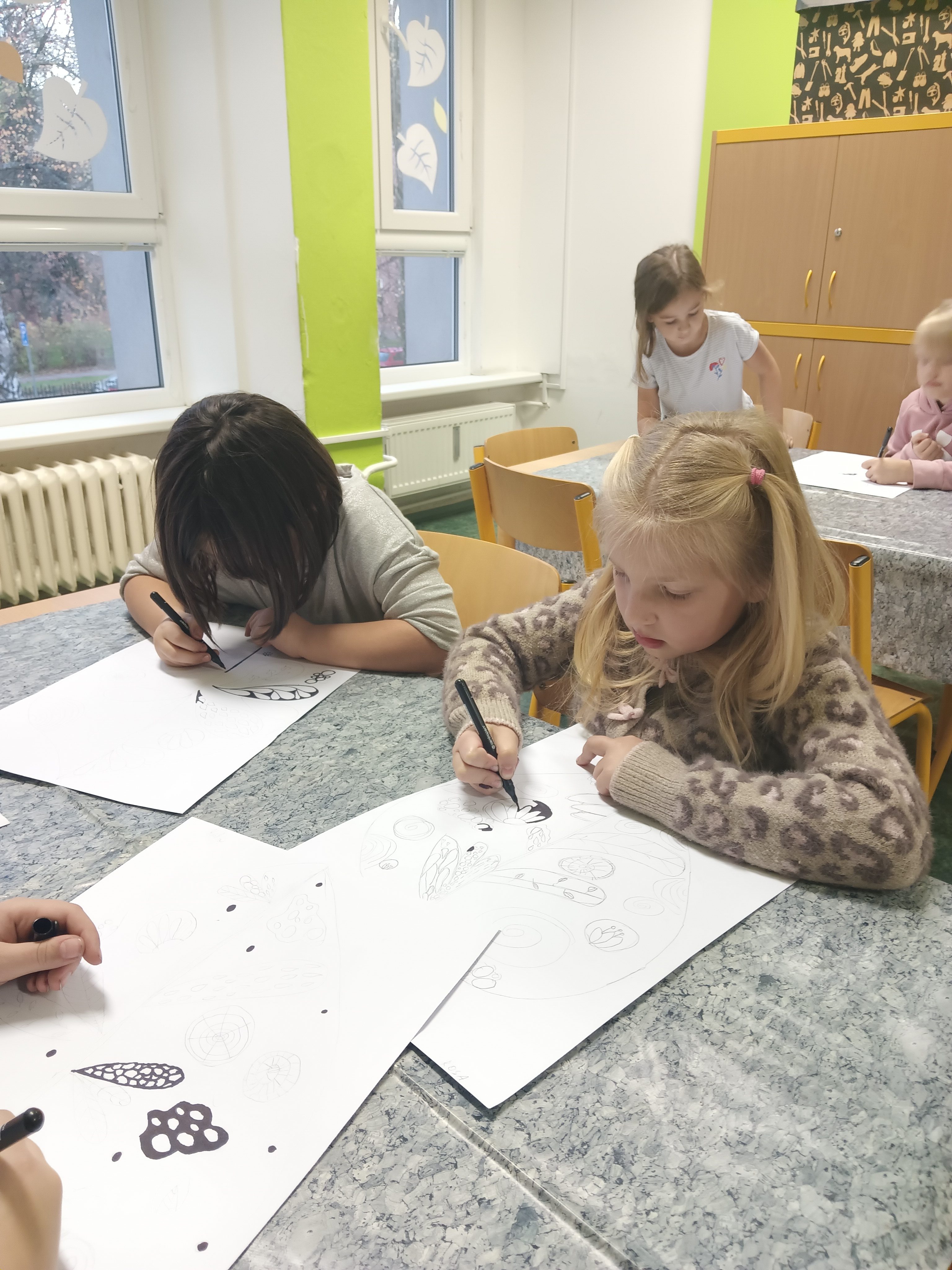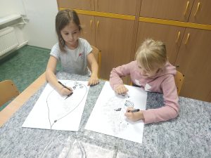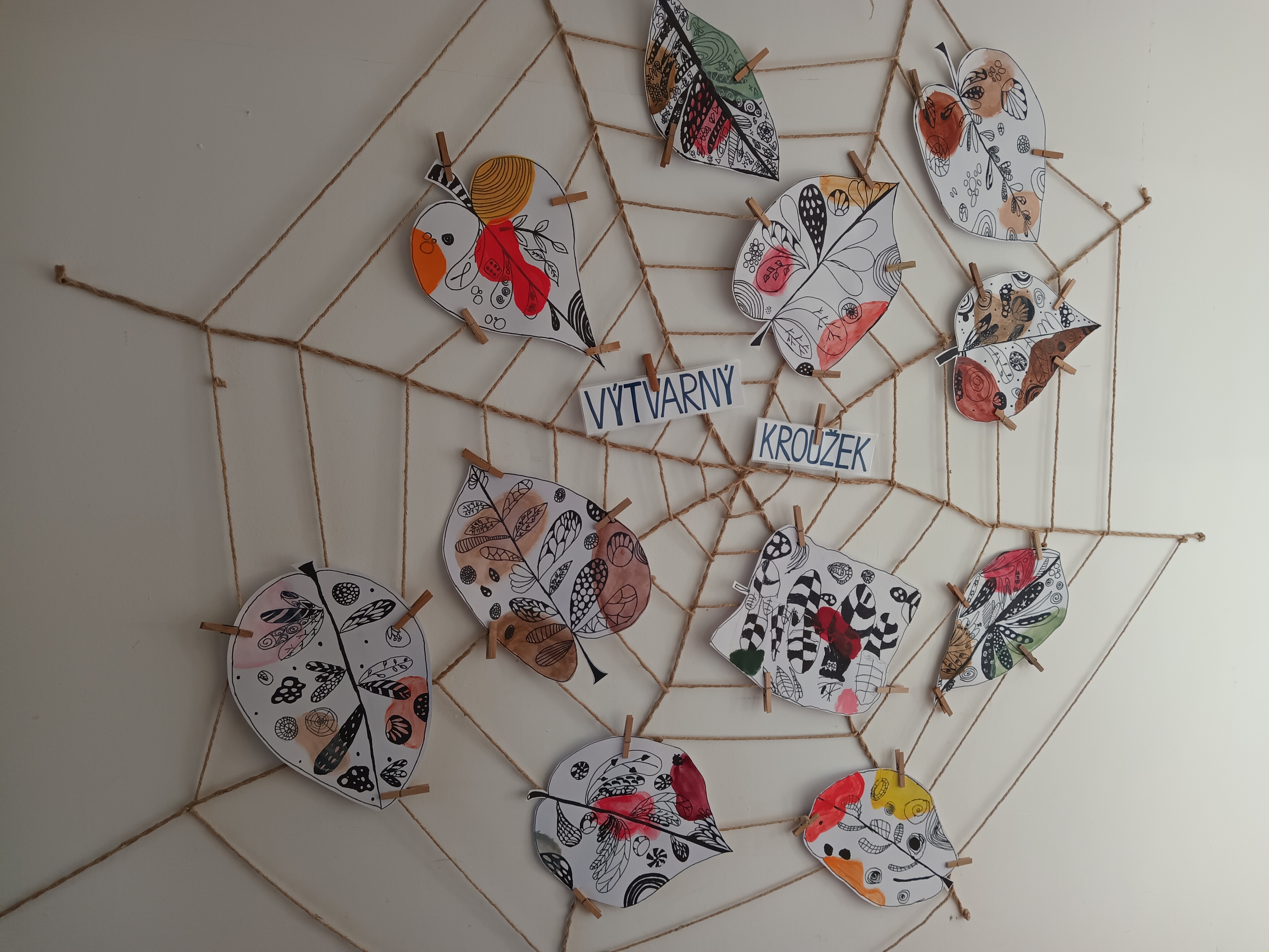 Děti ve výtvarném kroužku dnes tvořily s opravdovým nadšením. Každý z nich dostal jednoduchý úkol, nakreslit list. Nejprve pečlivě obkreslily linie, poté je doplnily temperovou barvou, která dodala jejich obrázkům jemnost i výraznost. Nakonec vše zvýraznily černým fixem, takže se jejich práce krásně rozzářily. Hotové výkresy jsme dali na nástěnku.