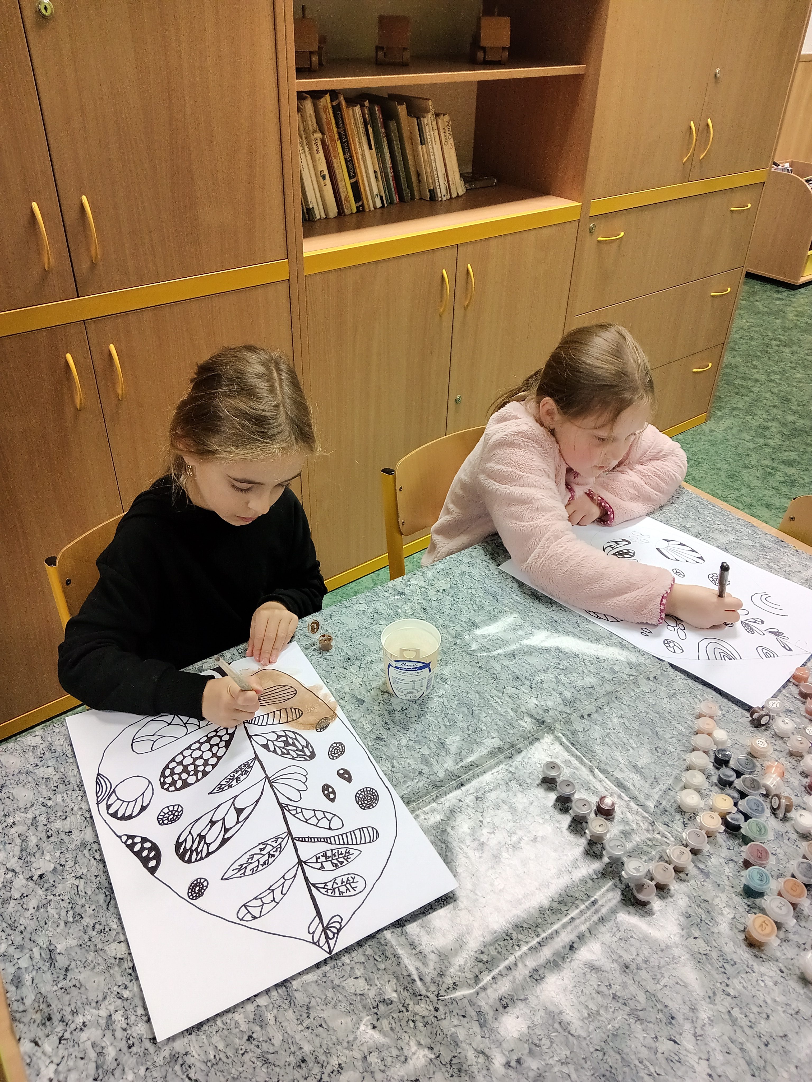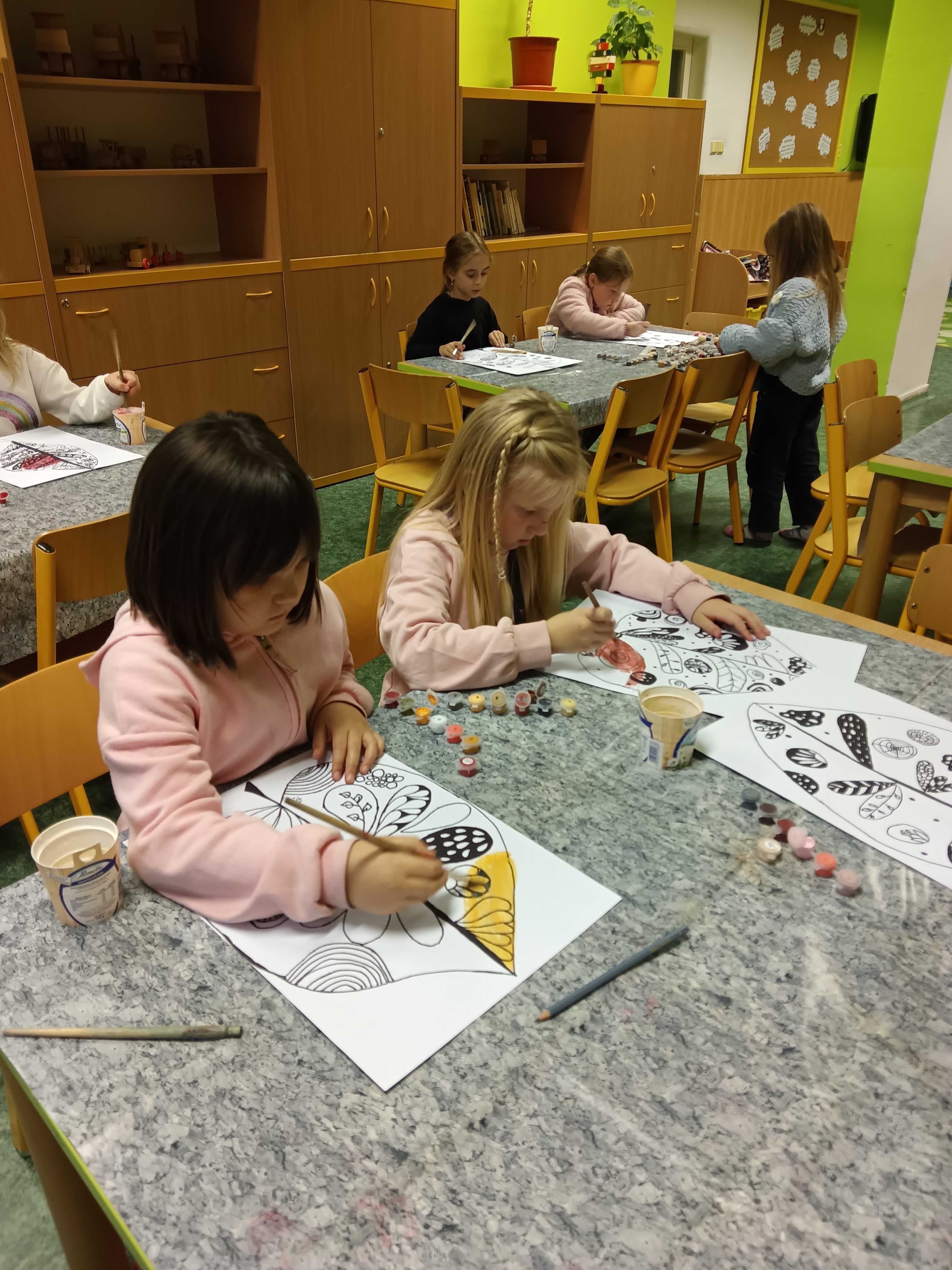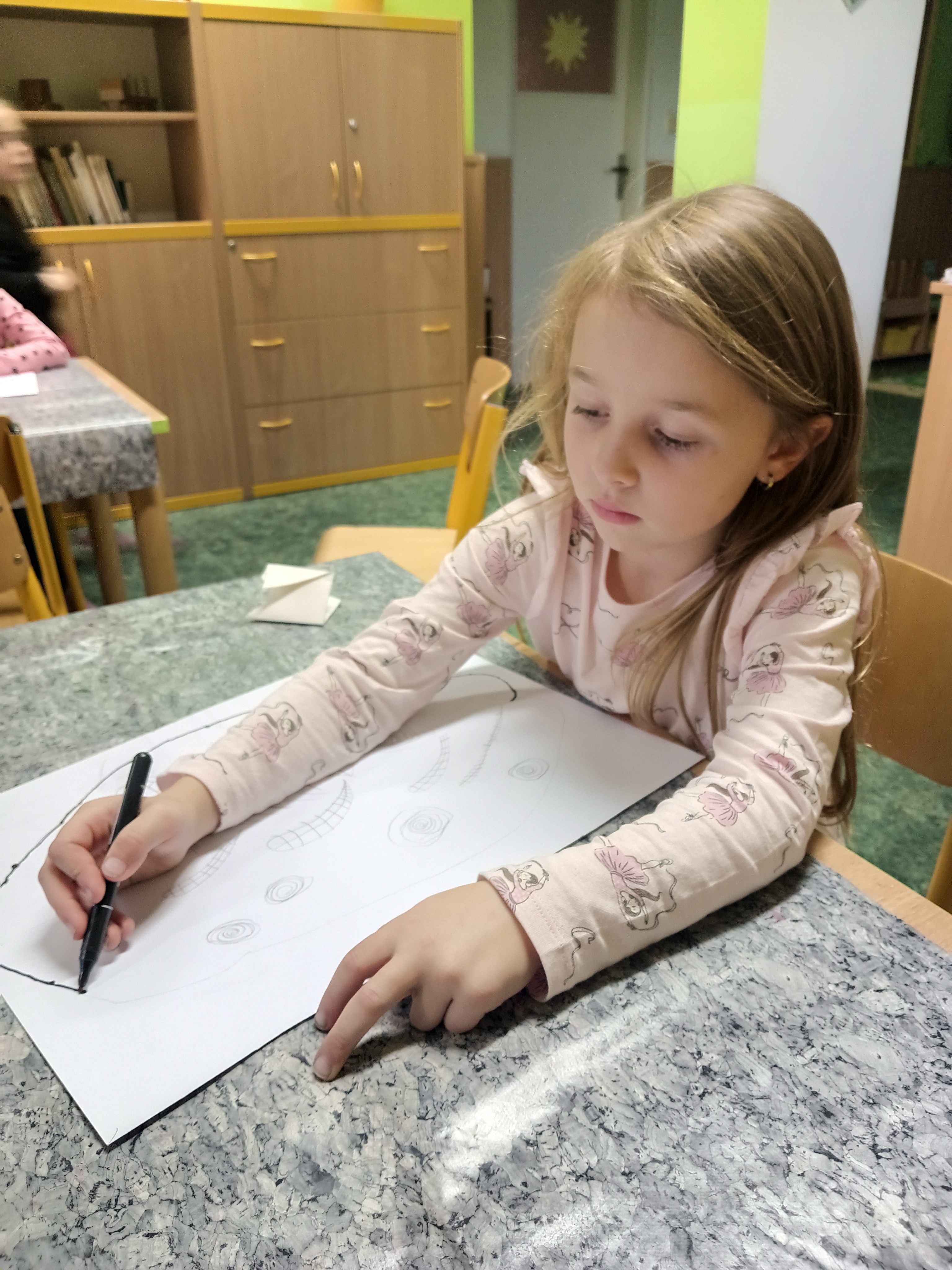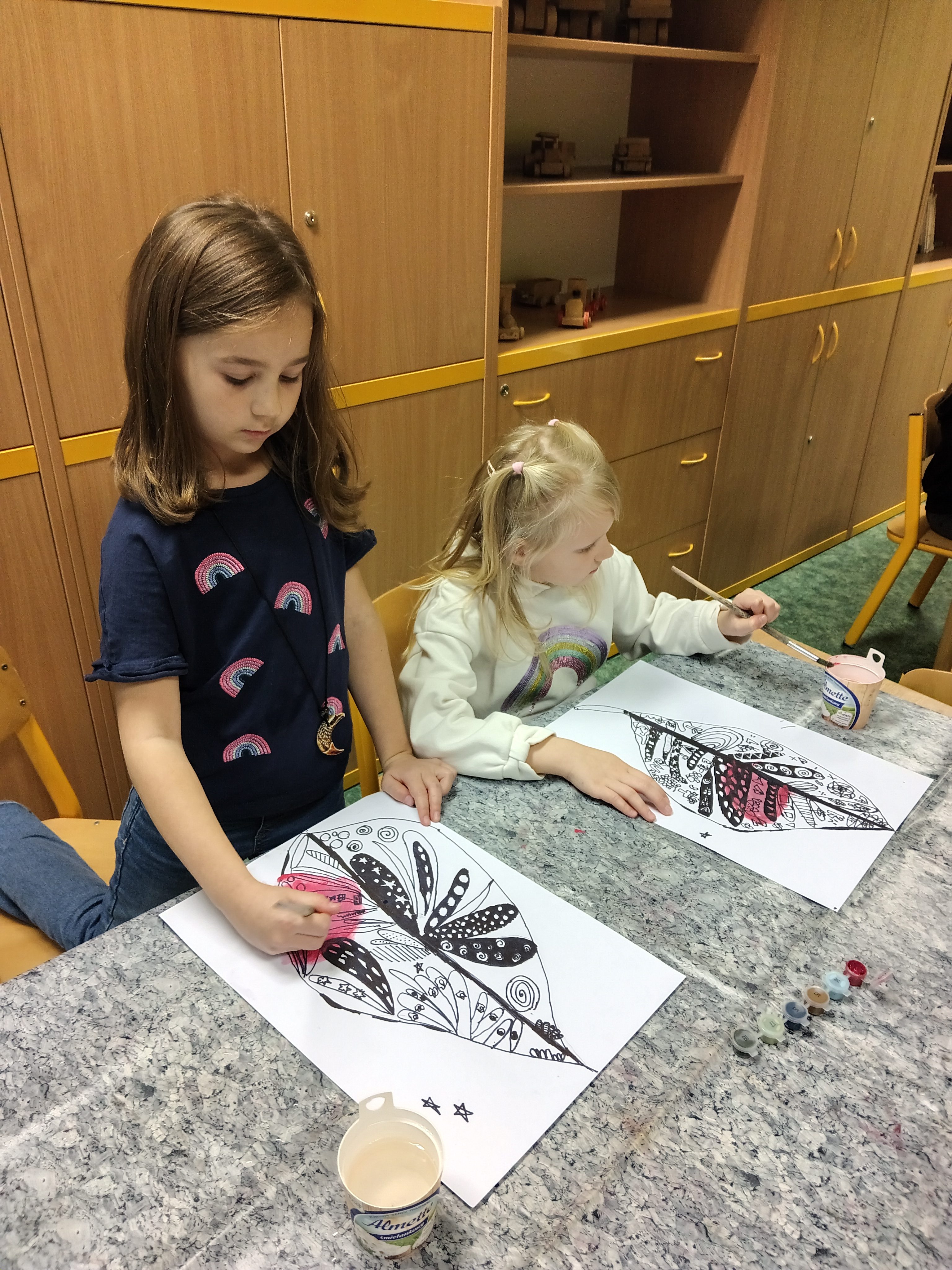 Děti ve výtvarném kroužku dnes tvořily s opravdovým nadšením. Každý z nich dostal jednoduchý úkol, nakreslit list. Nejprve pečlivě obkreslily linie, poté je doplnily temperovou barvou, která dodala jejich obrázkům jemnost i výraznost. Nakonec vše zvýraznily černým fixem, takže se jejich práce krásně rozzářily. Hotové výkresy jsme dali na nástěnku.