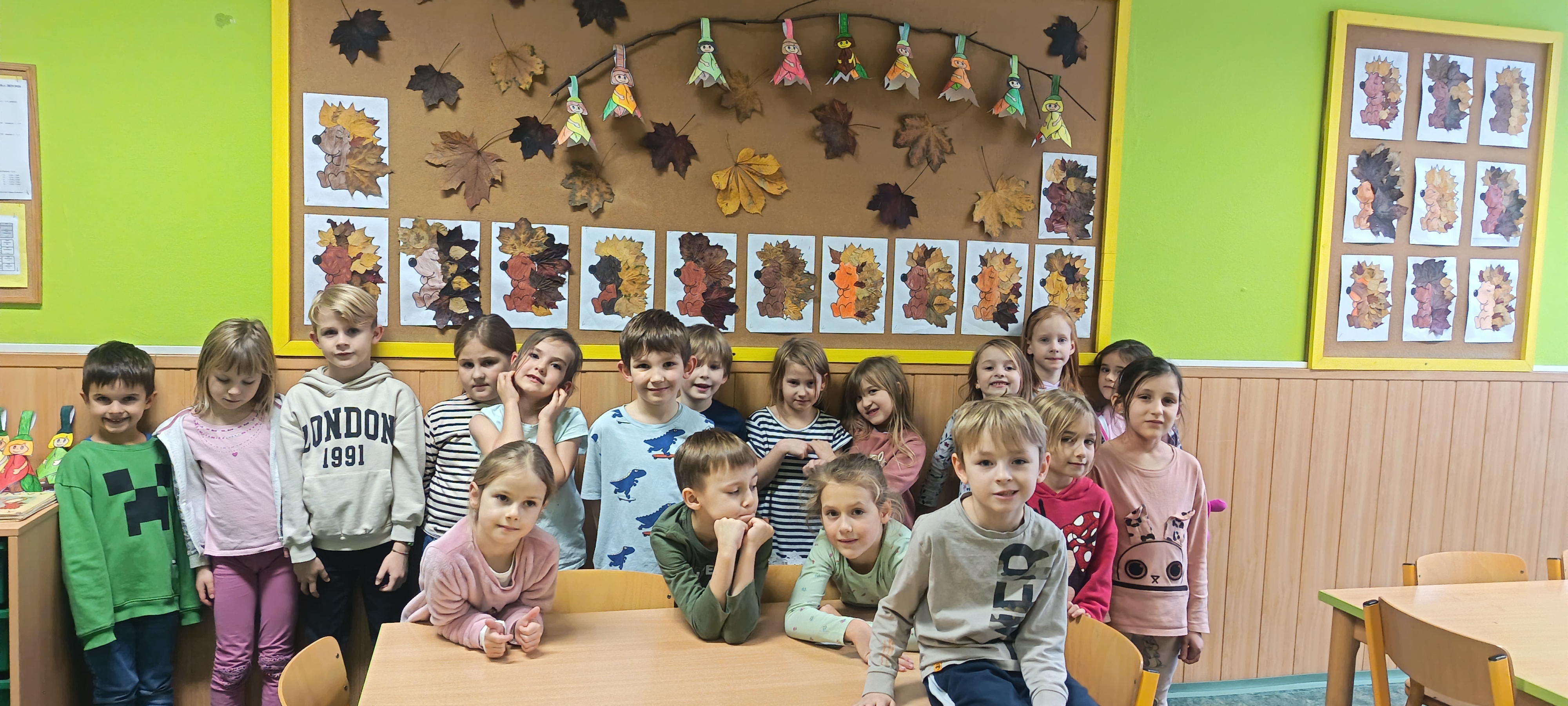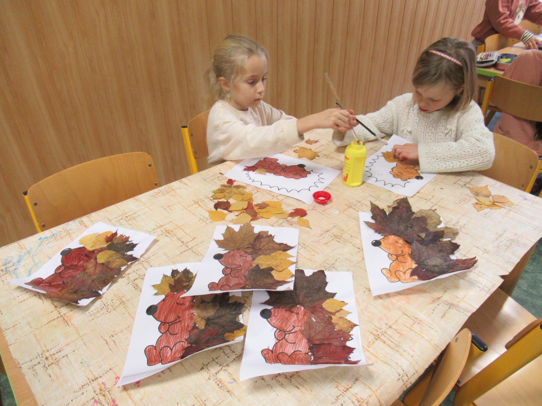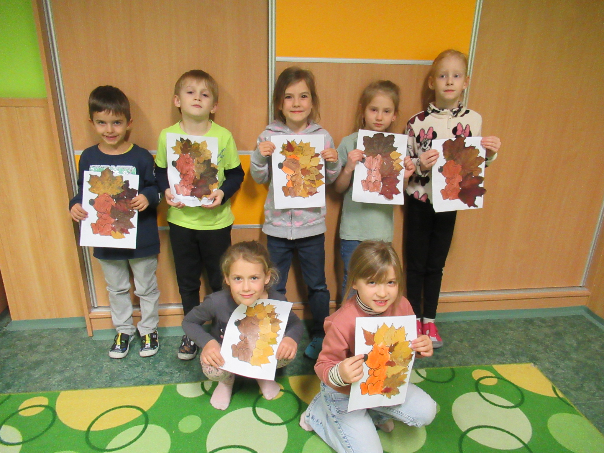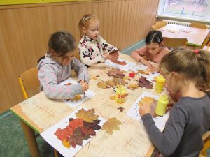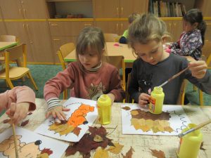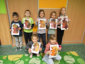 Když byly listy vylisované, pustili jsme se do podzimního tvoření. Každé dítě dostalo papír s natištěným obrázkem ježka. Děti si ježka vybarvily a místo bodlin mu nalepily nasušené listy. Vznikli tak originální a velmi povedení podzimní ježci. Hotové práce jsme vystavili na nástěnkách ve třídě.