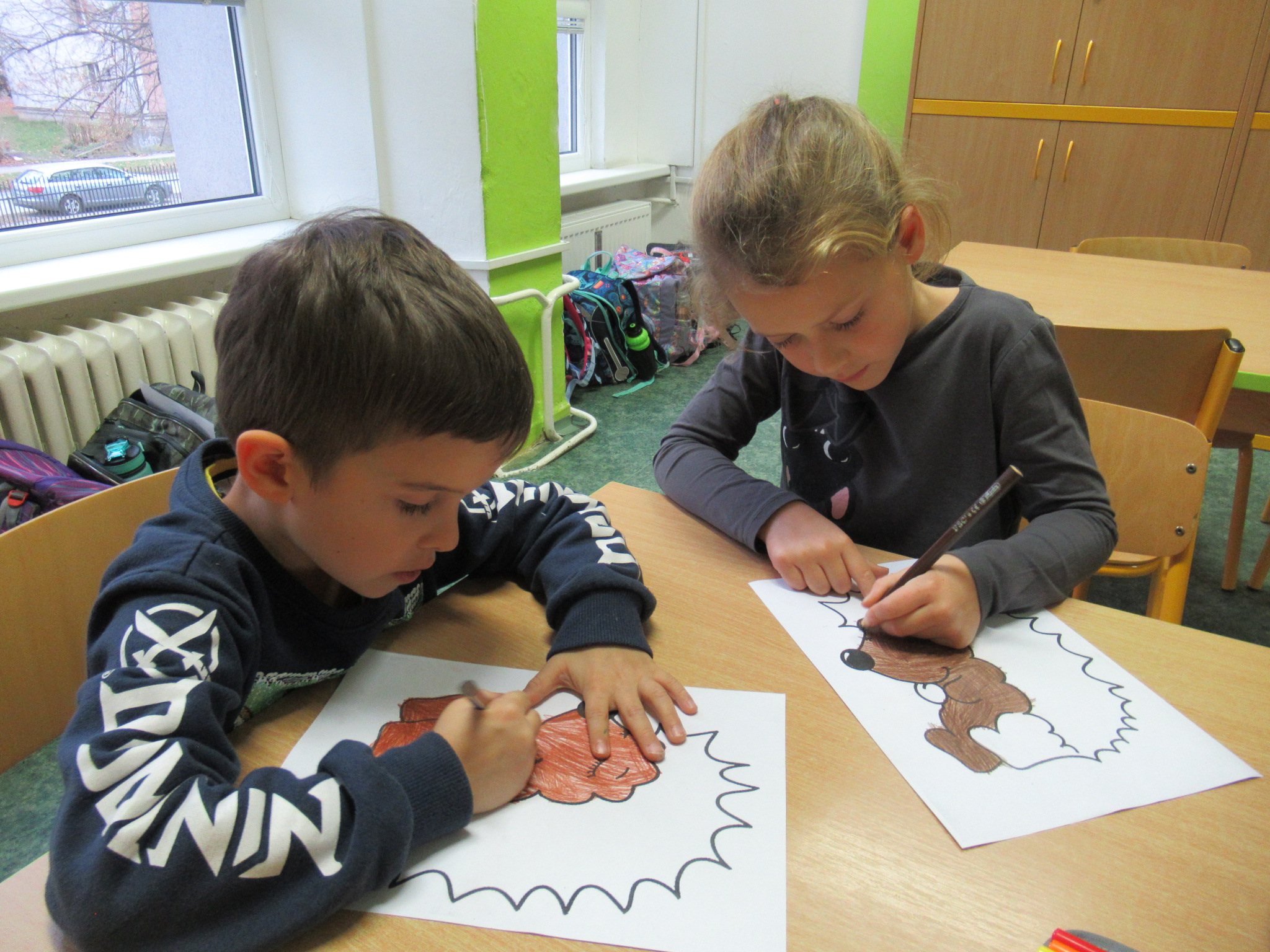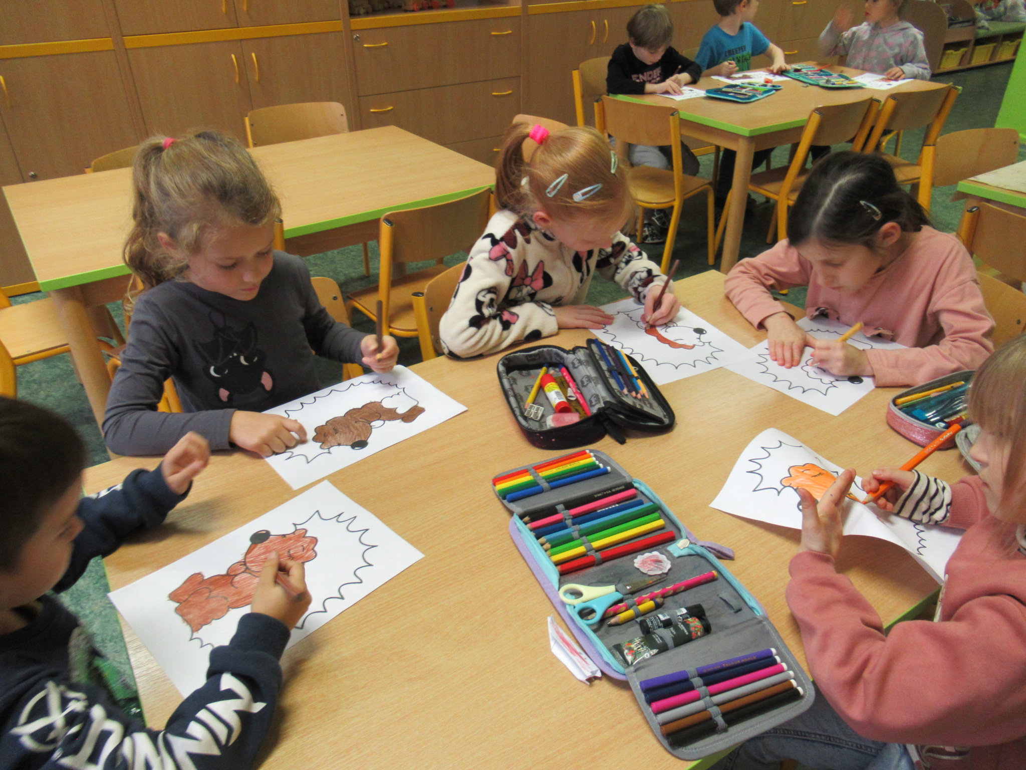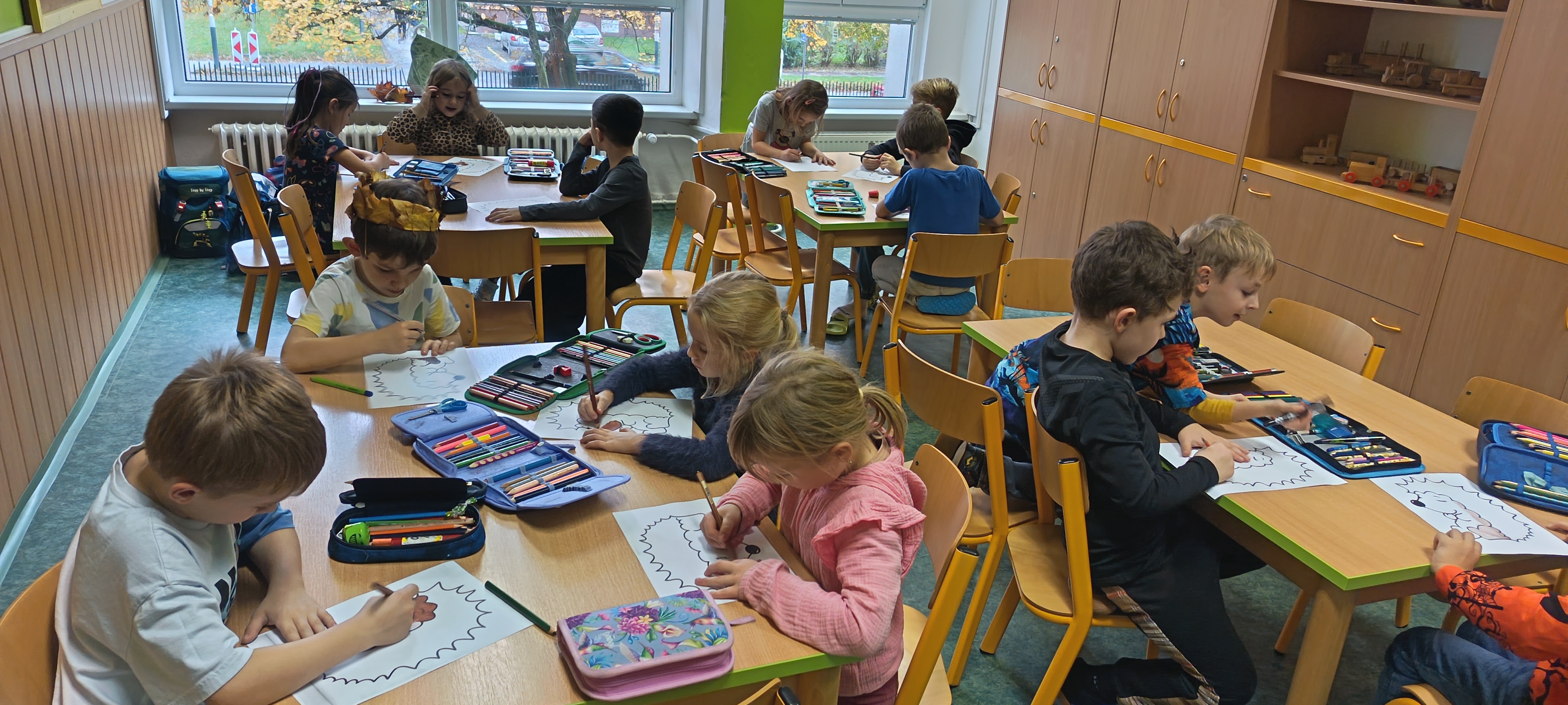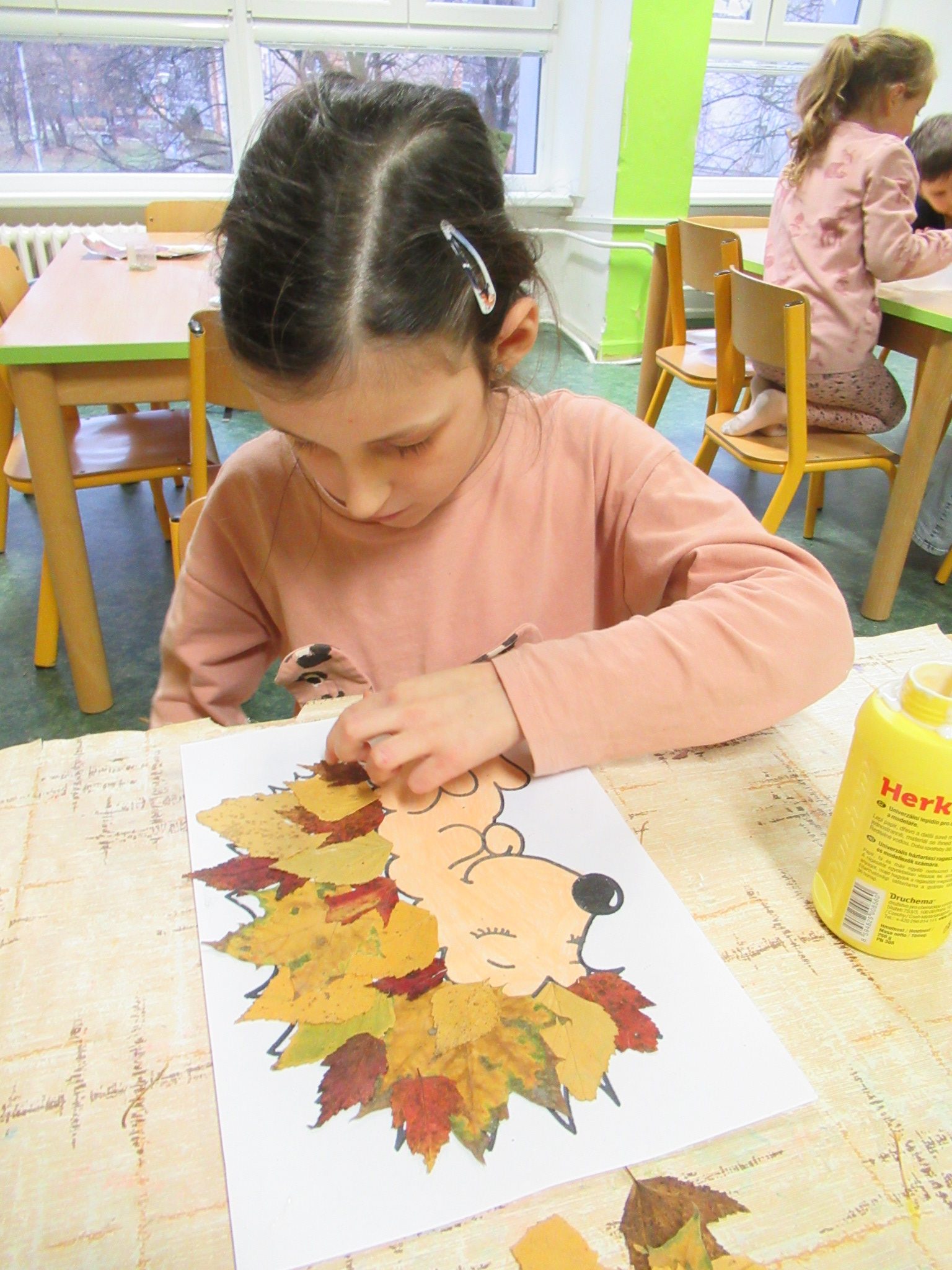 Když byly listy vylisované, pustili jsme se do podzimního tvoření. Každé dítě dostalo papír s natištěným obrázkem ježka. Děti si ježka vybarvily a místo bodlin mu nalepily nasušené listy. Vznikli tak originální a velmi povedení podzimní ježci. Hotové práce jsme vystavili na nástěnkách ve třídě.