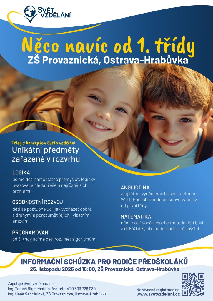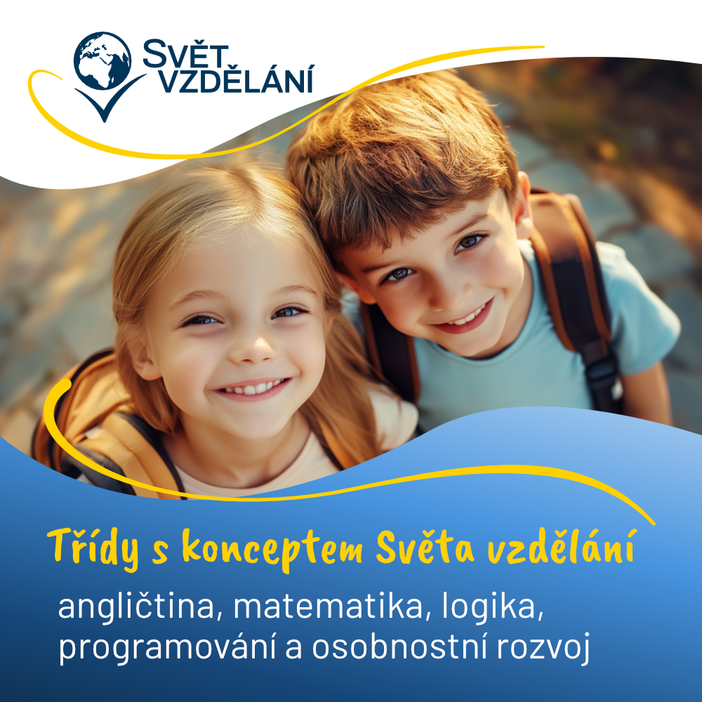 Svět vzdělání doplňuje rozvrh třídy o 5 hodin týdně. Z měsíčních příspěvků rodičů realizuje výuku doplňkových hodin angličtiny, osobnostního rozvoje, logiky, programování a dalších. Matematika je v těchto třídách vyučovaná Hejného metodou. Více informací, termíny informačních schůzek a přihlášku najdete na webu: https://svetvzdelani.cz/